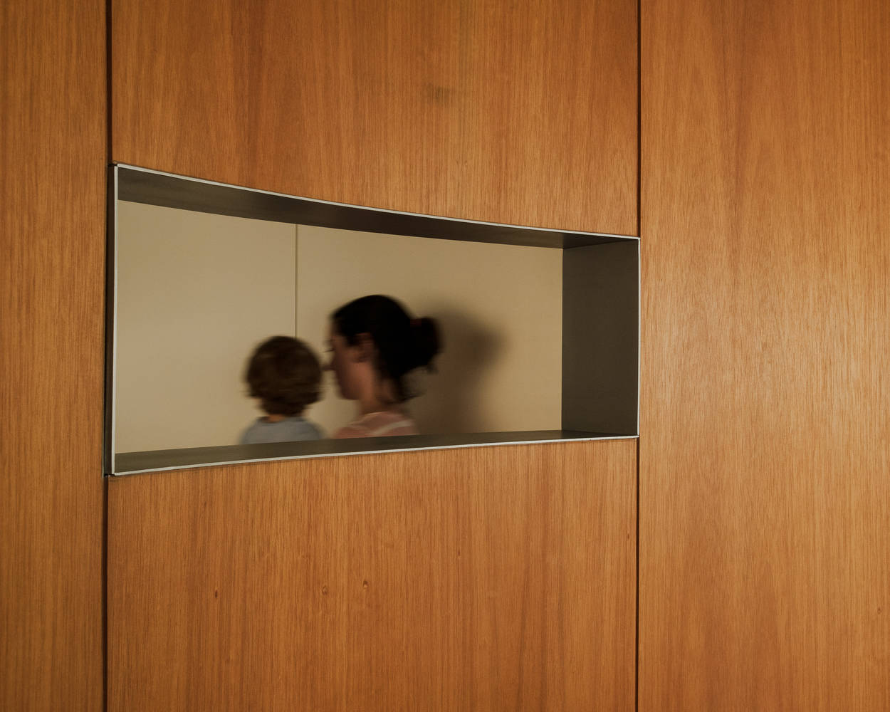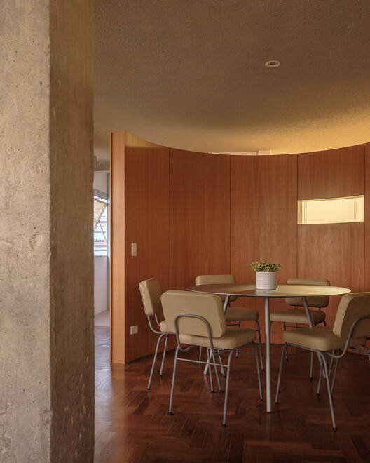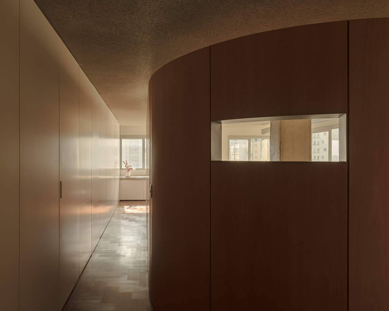 另一方面,空间的物质性得到了新的关注。环绕餐厅和客厅的弧形墙壁的顶部与天花板分离,并采用陶阿利木板完成。里面开了一条隐蔽的通道,把它和厨房连接起来。窗户上的琥珀色薄膜得到了保留,使生活空间被柔和的暖色照亮,在缎白色的平面和木制家具以及阳极氧化铝设计的元素中得到了放大,如悬挂的线性灯和餐桌。