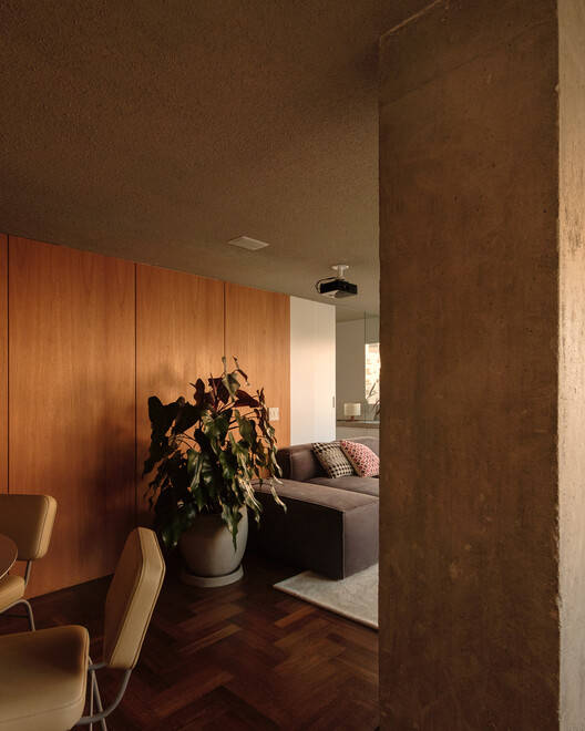 空间与光线的巧妙融合:该项目最令人印象深刻的方面在于它对光线的巧妙运用。通过保留并强化窗户上的琥珀色薄膜,设计师成功地营造出一种温暖、舒适的氛围。这种光线的运用不仅照亮了生活空间,更与室内柔和的色调、木质家具以及阳极氧化铝制成的设计元素相得益彰,形成了视觉上的和谐统一。此外,天花板粗糙的质感,是对原有项目时代圣保罗建筑的致敬,同时也为空间增添了一丝历史感和温馨的家庭氛围,彰显了设计师对细节的关注和对建筑历史的尊重。