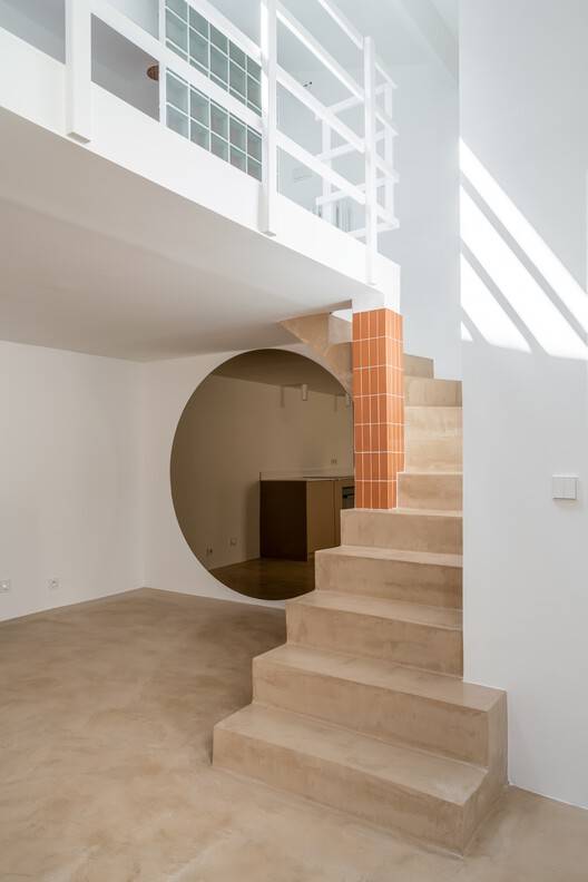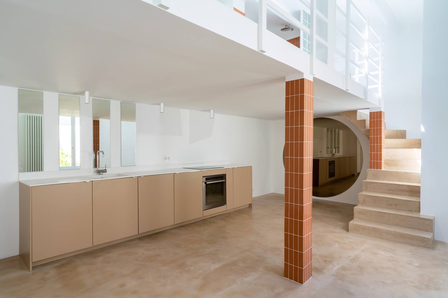 This small loft features 3 materials: Waxed concrete on level zero (living room and WC) and the bathroom floor creates a base for the apartment, anchoring the activity space on the ground floor and accentuating the almost sculptural character of the staircase. The kitchen, in the same tones, is designed as an extrusion of the floor.