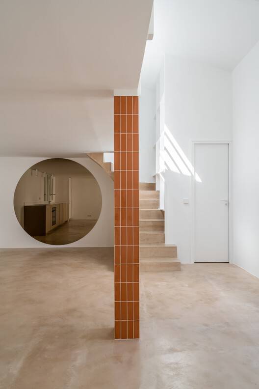 砖色的山脊占据了一楼的柱子,然后像褶皱一样沿着浴室展开。它为公寓赋予了结构和节奏。厨房橱柜中的4个镜条与柱子相呼应,反射窗户的光线,而一个大的圆形有色镜子则标识了用餐区,同时为公寓最黑暗的区域提供了视角。