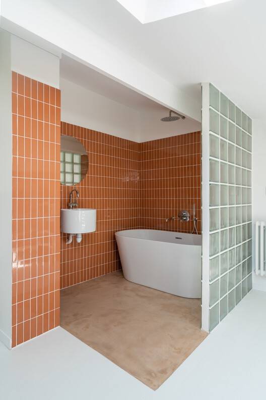 The brick velvet curtain, like the kitchen on the ground floor, is an extension of a language present in the apartment. Opposite the library, another vertical screen responds to it: the glass paving stone wall of the bathroom, which creates the alcove required for this space while allowing light to pass through.