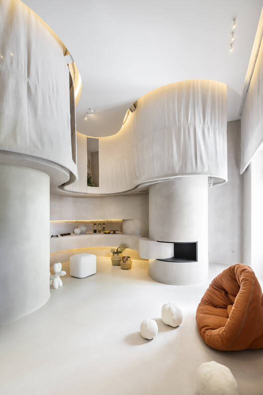 该设计采用了Atenzza的高级Ecoplen技术,利用不同层次的织物褶皱来优化声学性能、空气净化、阳光自清洁、抗菌、除臭和隔热。该空间包括一个梦幻般的上层和一个适合人类的底层电路,设有私密的休息区。鼓励健康、充满活力的生活方式,这座房子采用了100%的天然材料,创造了一个自然的包覆皮肤。萨洛尼和Ecoclay的ESSENCEA陶瓷进一步增强了建筑的设计。
