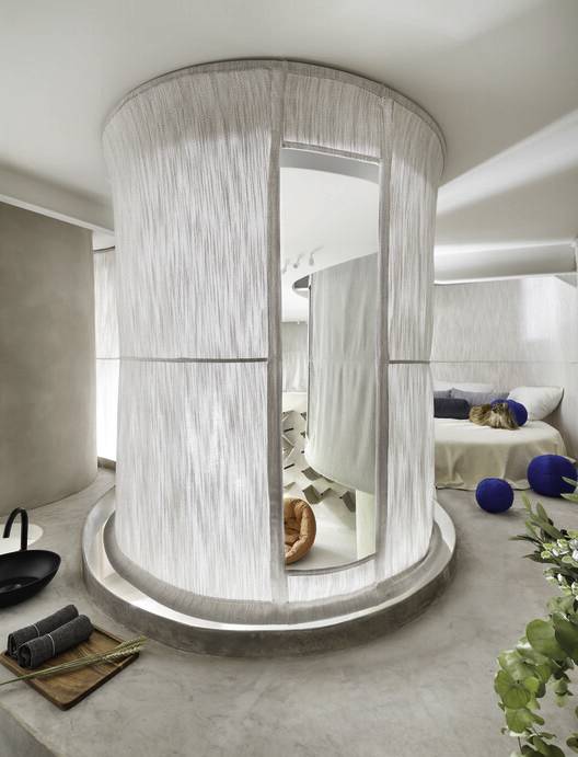 27 m2, is the blank canvas for two symbolic cylindrical elements. they represents tree trunks which rise thanks to the optimal characteristics of the brand's textile material, performing branches and leaves which are expanding the different planes of use in three dimensions. These elements constitude an organic, airy and ethereal frame like the treetops, mass without weight, sculpting the interior of the house and recreating a fantastic, creative and motivational scenario. The material and structural sensations of the design appeal to the coexistence of the species, facilitating the contact between animals in the house. simultaneously, they promote the communication and positivity necessary for coexistence in metropolitan cities.