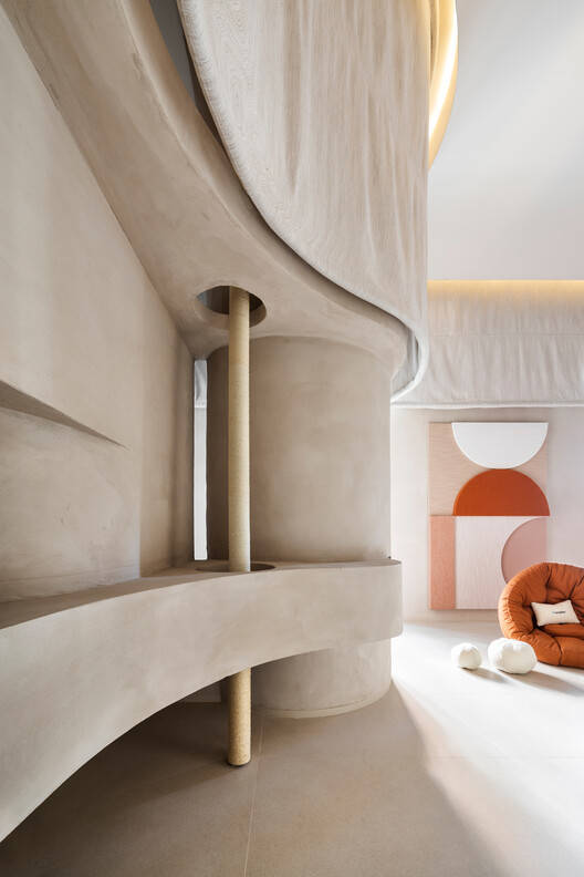 材料与技术的巧妙结合:项目的另一大亮点是对于材料的精妙运用。设计师选择了Atenzza的高级Ecoplen技术,这种纺织材料不仅具有良好的物理性能,如隔音、净化空气等,更重要的是,其柔软、轻盈的质感,以及可塑性,赋予了设计师更大的创作自由度。通过褶皱、层次的变化,设计师将这种材料塑造成了树干和树冠的形态,创造出一种自然、通透的空间氛围。同时,项目也注重可持续性,采用天然材料,并结合陶瓷等环保材料,体现了设计师对于环境保护和健康居住理念的追求。这种材料与技术的完美结合,使得项目既具有美观性,又兼具功能性和可持续性。