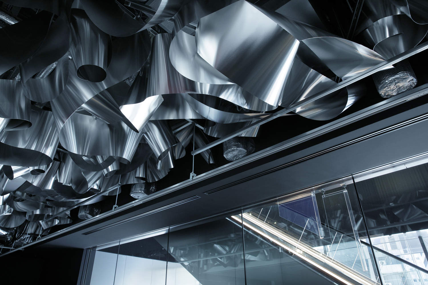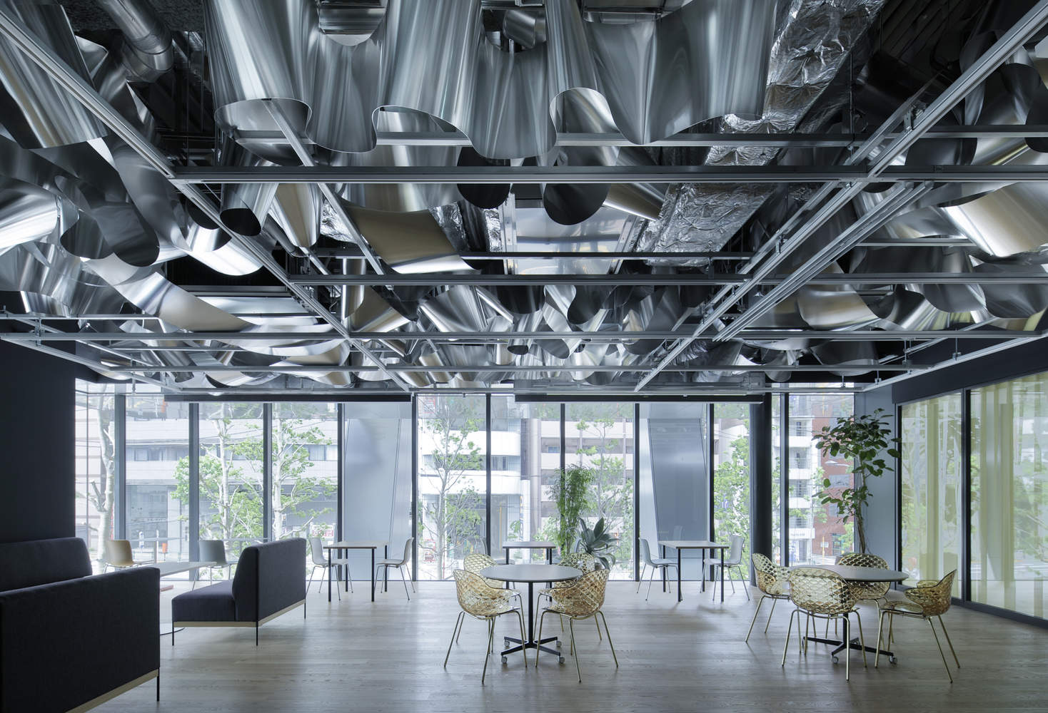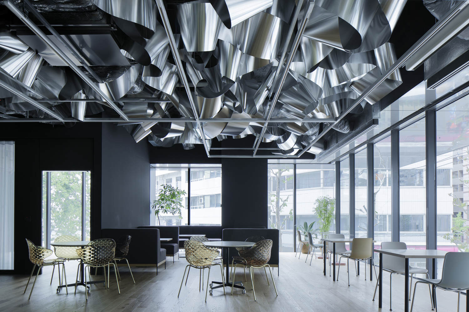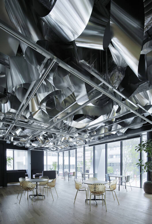 Here, a single "recycled" aluminum sheet is spread across the entire ceiling and fills the space with waves full of fresh vitality, reflecting light and producing soft glimmers like that of the sunlight shining on the surface of the paddy fields of yesteryear. The beautifully overlapping metallic waves create areas of different heights and expanses of space that change freely, just as water flows in a lively and reactive manner, thus suffusing the area with the necessary functions and atmosphere.