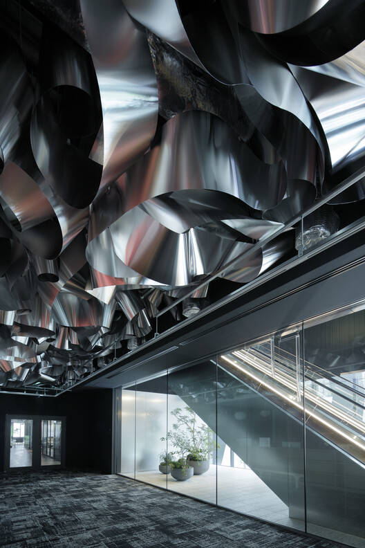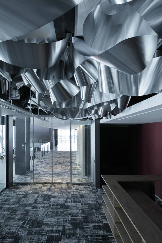 材料创新与可持续性:该项目在材料选择和可持续设计方面展现了卓越的创新精神。设计团队大胆采用了“再生”铝板作为主要材料,不仅赋予了空间独特的视觉效果,也体现了对环保理念的积极践行。通过巧妙地调整铝制天花板部件的组装方式,实现了材料的循环利用和空间的可持续性。这种设计手法既减少了材料浪费和搬迁成本,也倡导了一种以回收为导向的社会。这种对材料的创新运用和对可持续设计的实践,为未来的建筑设计提供了有益的借鉴和启示,也体现了设计团队对社会责任的担当。
