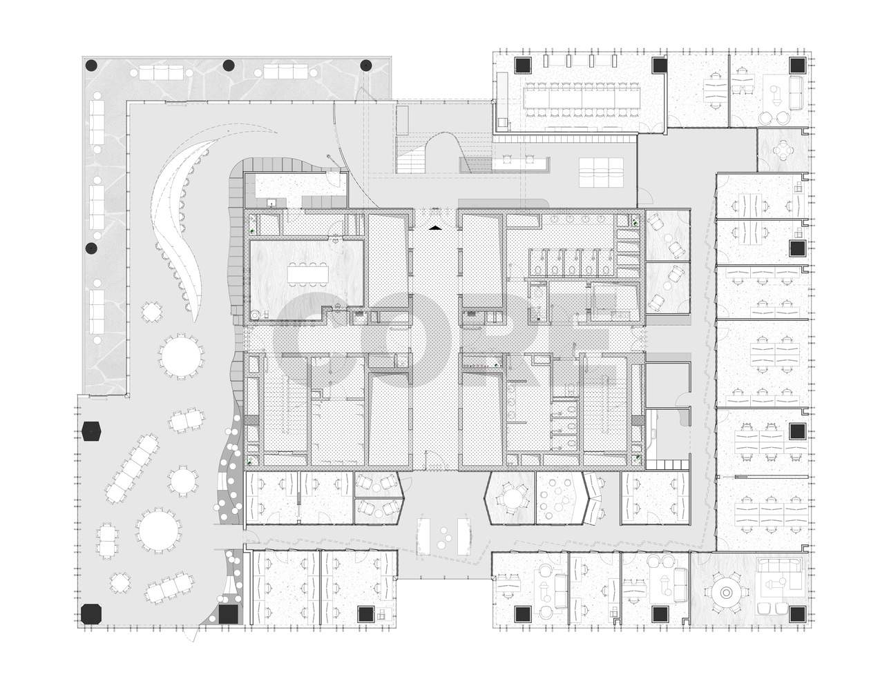 空间布局与材料运用的独特性:项目的空间布局体现了极高的专业水准。平面图显示了功能区域的清晰划分,矩形、圆形和三角形的几何形态贯穿始终,构成了一种富有节奏感的视觉语言。设计师对不同形状的巧妙组合和运用,打破了传统办公室的单调感,创造出一种充满活力和互动性的空间氛围。虽然缺乏材料的明确描述,但从图片来看,项目很可能采用了简约而现代的材料,与几何形态相呼应,营造出一种干净、通透的视觉效果,更加突出了空间的互动性和创新性。