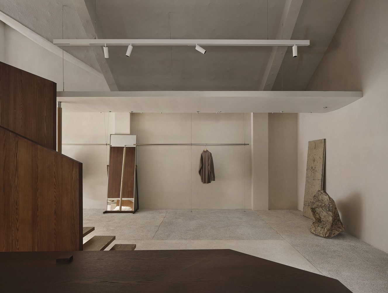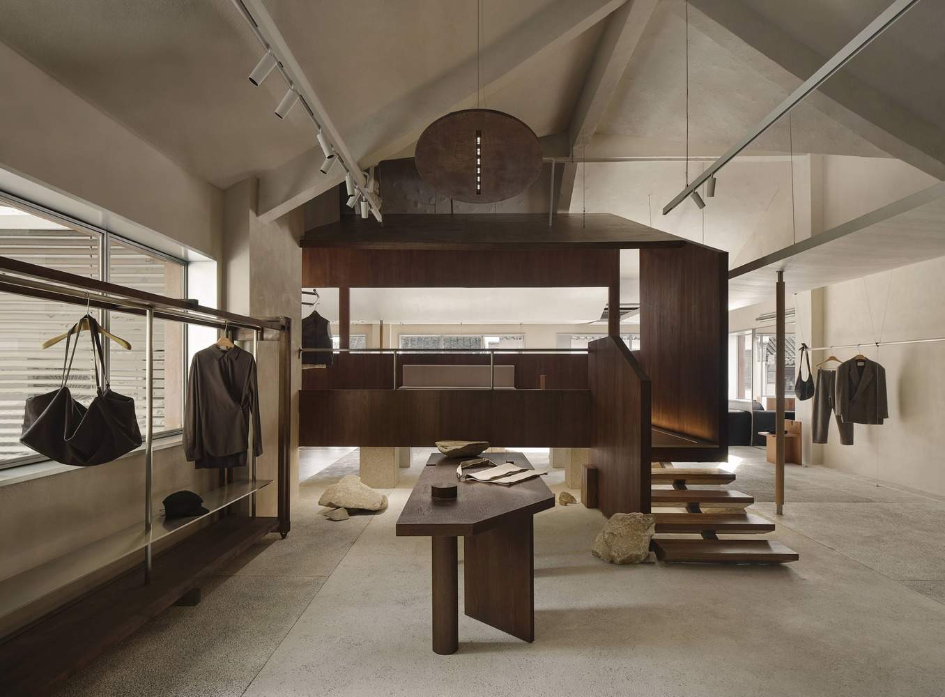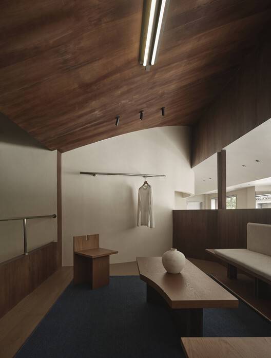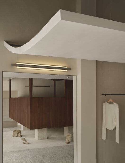 对于服装展示,空间沿着一条流动的路径组织,天花板微妙地弯曲,创造了一个充满故事的走廊式体验。不同类型的窗户、镜子和反光表面为客户提供了更丰富的视觉体验,几乎就像他们正在欣赏一幅活生生的风景画。入口处高大的垂直窗户与外部风景相互作用,透过窗户播放的树影为空间增添了深度和趣味性。