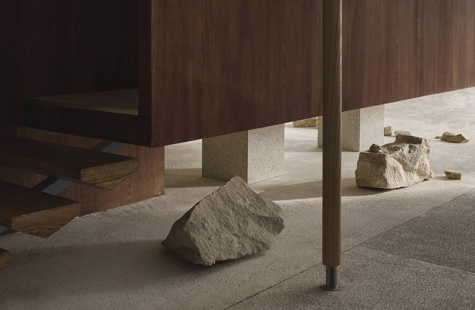 The interior design continues the concept of "pavilions" and "corridors," creating a "living room" space suitable for both relaxation and social interaction. A wooden pavilion is positioned at the corner of the space, designed like a tea room with an open structure and a suspended staircase, giving the space a light and artistic feel. The contrast between the stone base and the wooden structure enhances the spatial layers. A cylindrical element was added to soften the sharp corners and divide the space into a fitting room and a nail service area, improving functionality.
