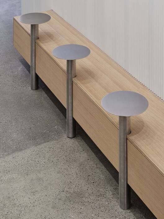 Milky’s与当地人喜爱的理发店the Fitting Room共享这个空间。西蒙不得不在两家公司狭窄的功能和美学重叠中穿行。材料、形式和颜色在商店之间协调一致,而细节则使它们与众不同。“空间内分散的浅色饰面与温暖的橡木色调相辅相成,成为客人参与和品牌激活的接触点。这些温暖的元素在空间中娱乐和引导人们的目光。”——Simone Ferkul Projects创始人Simone Ferku