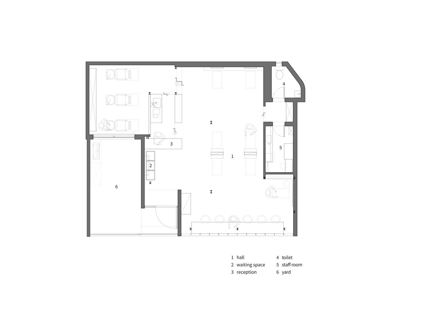 尽可能多地利用自然光,反射光的材料保持了其自然纹理和特性。从主厅到洗发水区的过渡具有微妙的层次变化,突出了经过压力处理的木材,随着时间的推移,木材展现出了它的魅力。这种过渡创造了一种开放但截然不同的空间体验。整个空间的功能性家具采用了各种材料和图案,为设计增添了多样性和个性。