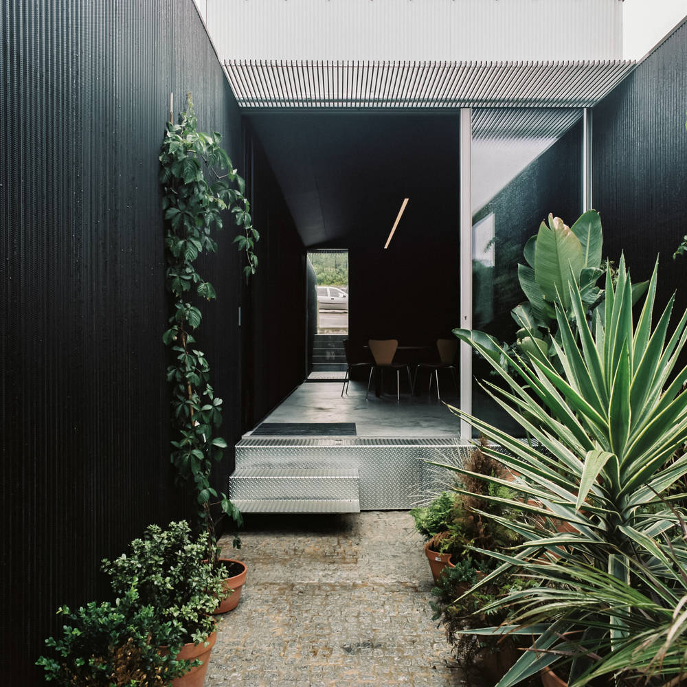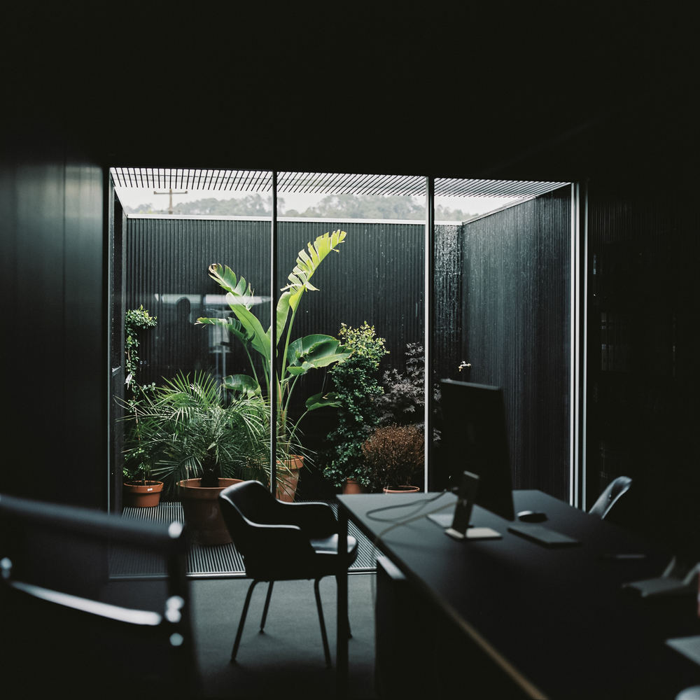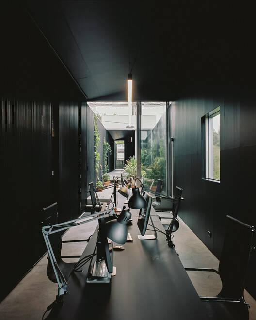 空间布局与自然元素的和谐统一: 新建办公空间的设计充分考虑了场地限制,采用细长型建筑,并通过庭院的引入,实现了自然光线和通风的最大化。庭院与室内空间的融合,创造了一个内外一体的开放空间,为员工提供了舒适的工作环境。滑动窗的运用进一步强化了这种空间上的连通性,使得内外景观得以互动。而连续的哑光黑色外观,则巧妙地突出了外部光线和植被的色彩。这种对自然元素的巧妙运用,不仅提升了建筑的视觉美感,也创造了宜人的工作氛围。空间布局的灵活和自然元素的融入,是这个项目在功能性和美学上的亮点。