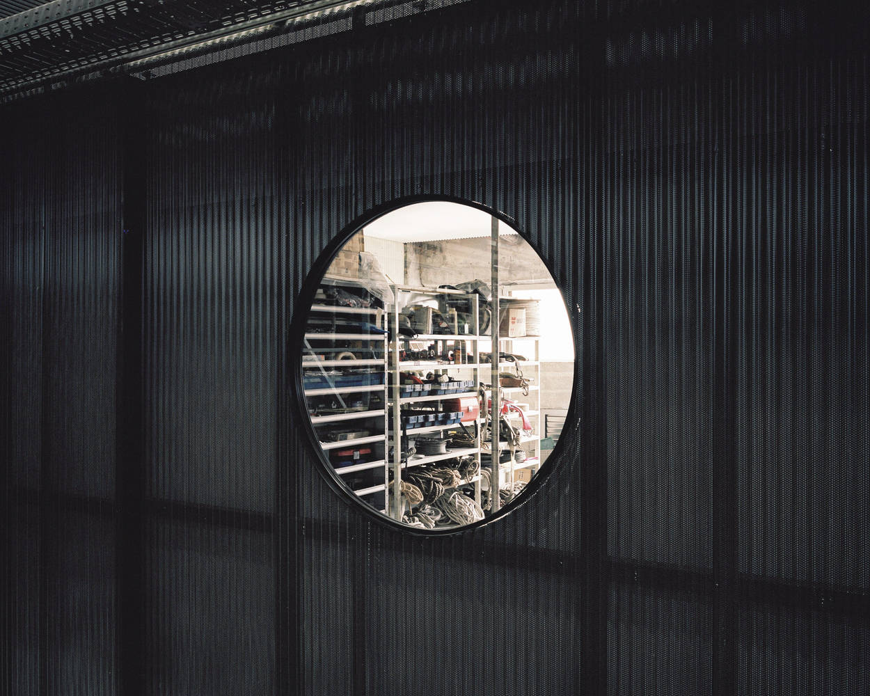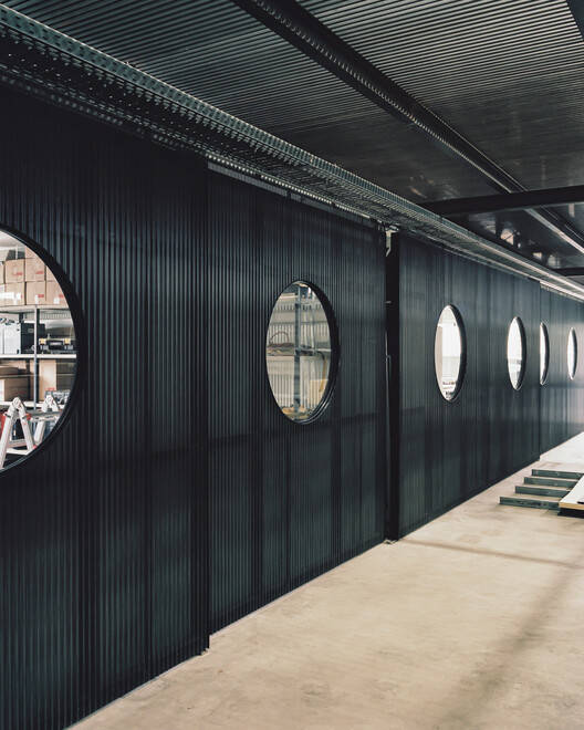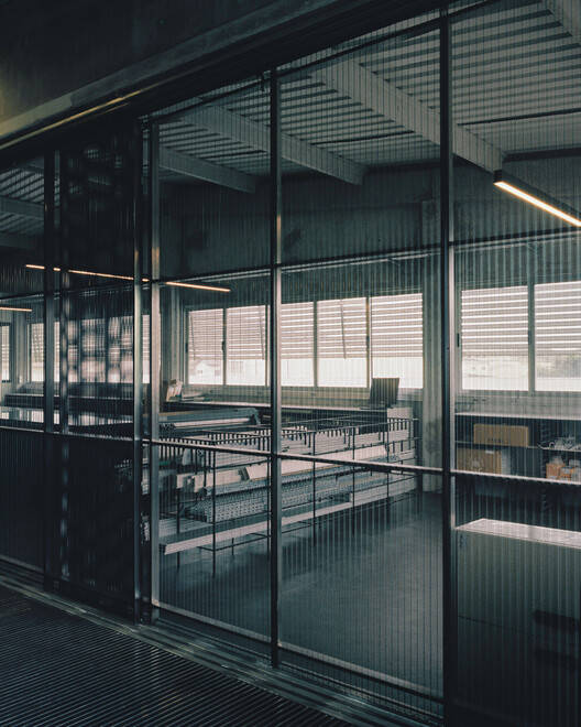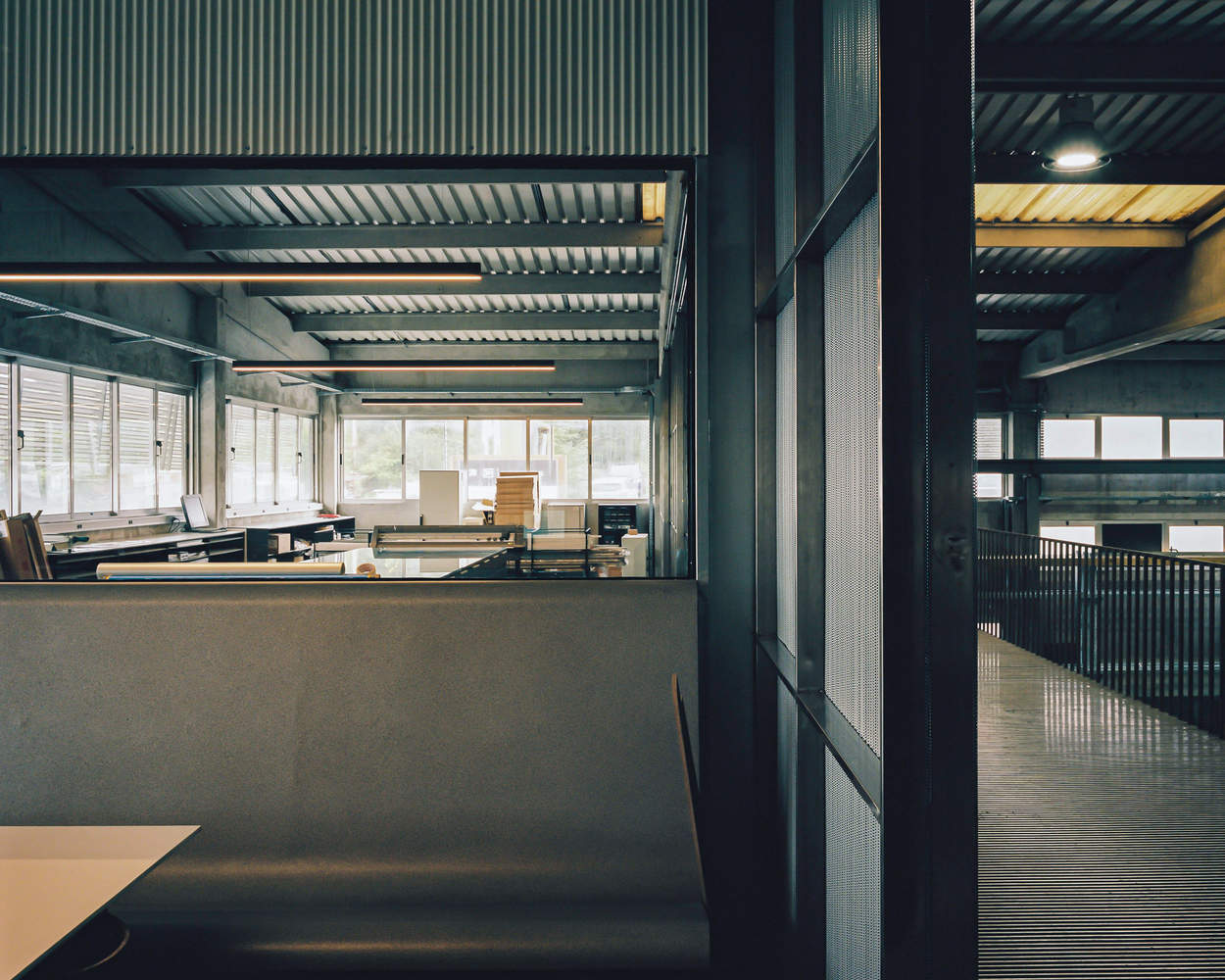 In the existing industrial warehouse, small adaptations were made to fit the building for its new use. In the area previously occupied by the factory offices, new changing rooms, screwing room, and laser cutting machine room were introduced on the ground floor, while a kitchen dining area and production room were added on the upper floor. A new metal gallery extends the existing area, and a retractable railing allows for loading and unloading with a forklift. Both this structure and the interior partitions, furniture, and the door system that creates a new interior façade were either produced on-site or reused from existing parts.