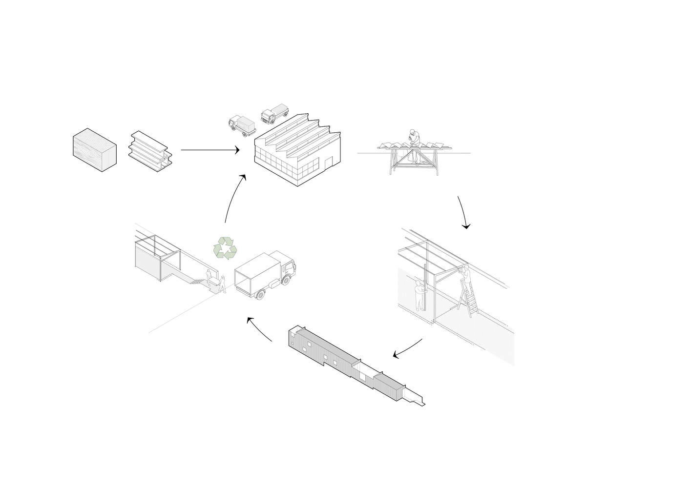 可持续性与装配式建造的创新应用:该项目在可持续性方面展现了卓越的实践。设计充分考虑了建筑的可拆卸、再利用和回收,体现了循环经济的理念。建筑主体结构和外立面的模块化设计,使得现场装配变得高效且简单,仅需两人即可完成。这种装配式建造方式,不仅缩短了工期,降低了成本,也减少了对环境的影响。此外,室内木质装饰、自然通风和采光、以及冬季的木炉和地暖,都体现了对可持续发展原则的深刻理解。建筑师通过技术创新和材料选择,打造了一个环保、高效且具有独特风格的办公场所,展现了建筑设计的未来趋势。