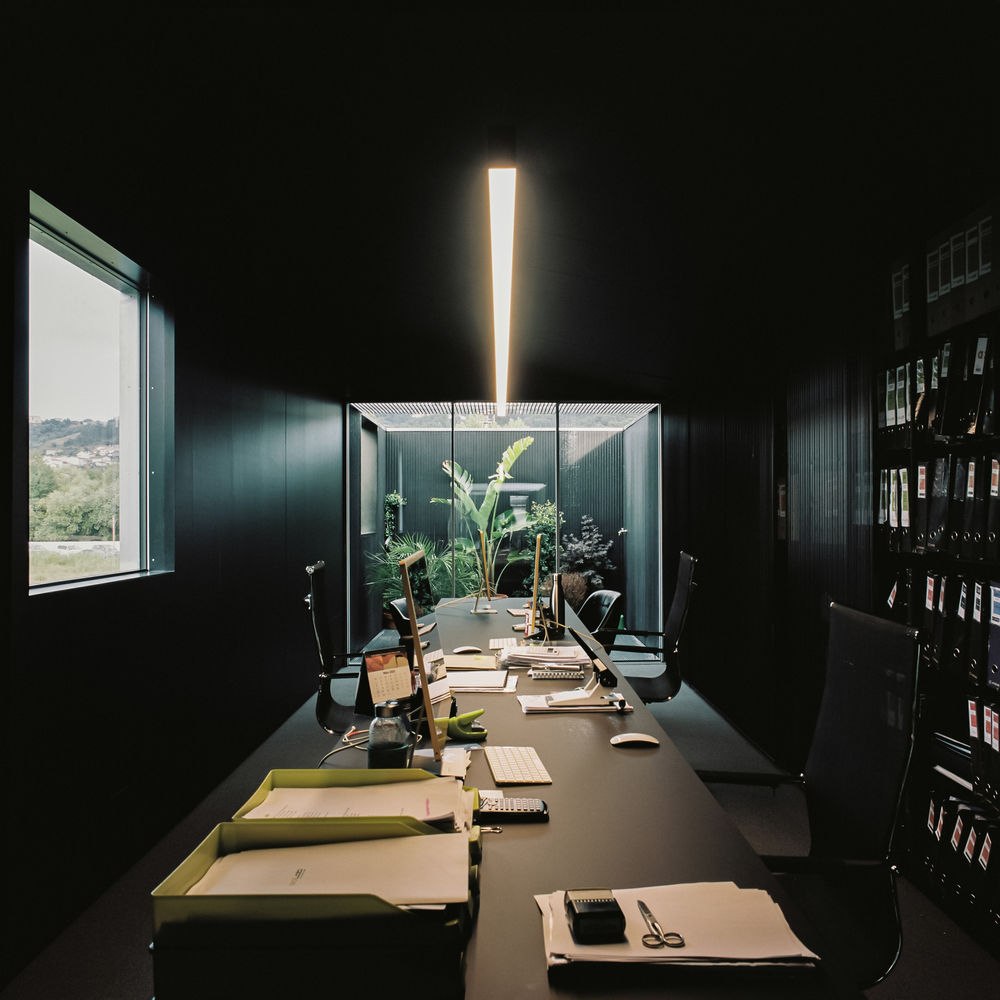 Regarding the new offices, the limitations of the available area led to a solution of an elongated building, adapted to the natural topography. Its total length, 3 x 50m, is interrupted by courtyards that introduce natural light and ventilation. These courtyards, along with the interior, form a single integrated space, functioning as outdoor interiors. Sliding windows were used to spatially connect the ensemble, and a continuous matte black finish was chosen for both to highlight the external light and the lushness of the vegetation.