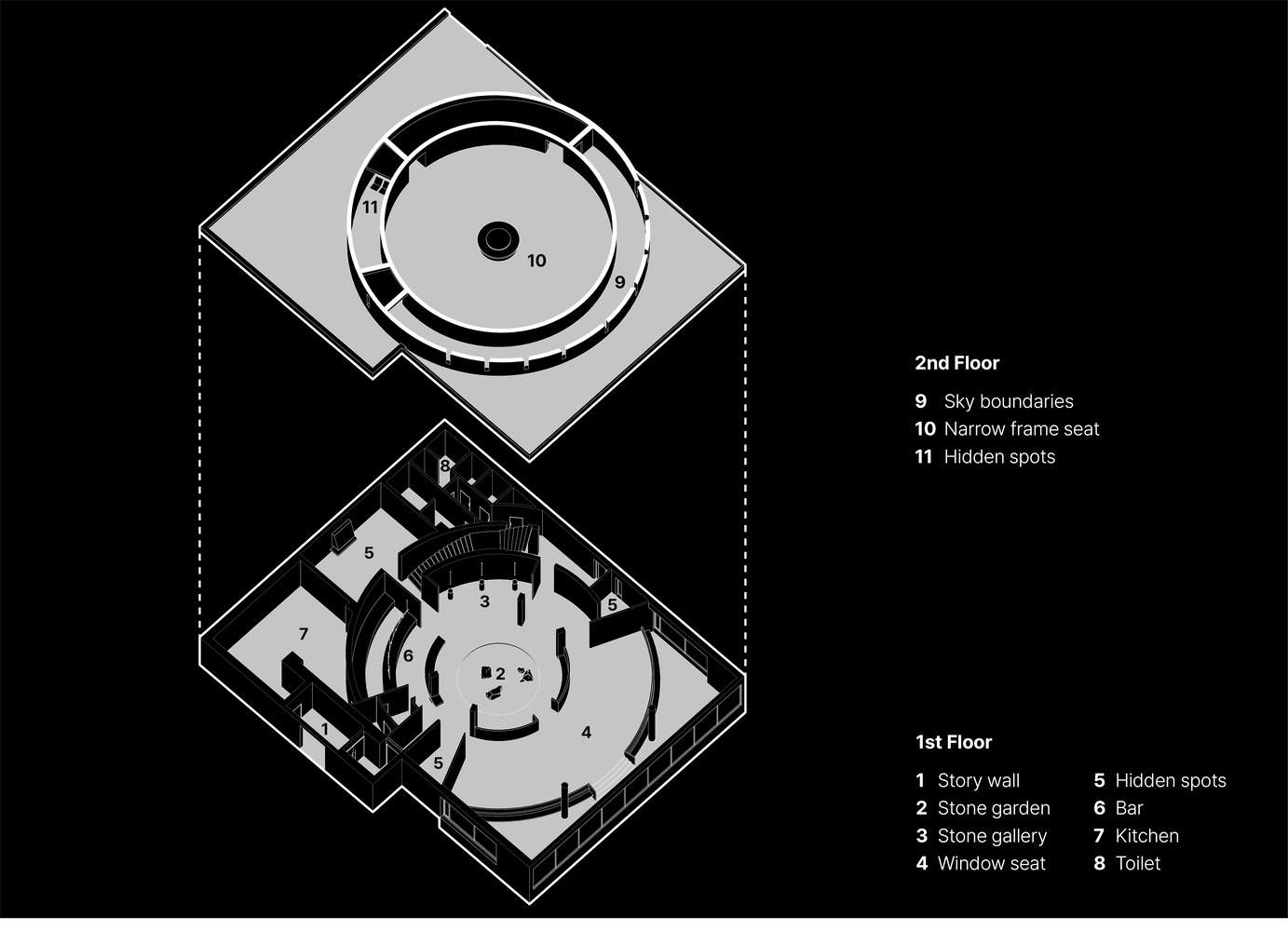 空间布局与自然环境的互动: 该项目的亮点之一在于其对空间布局的精心设计,以及与周围自然环境的互动。圆形墙体的设置不仅定义了空间边界,更巧妙地引导了视线和动线,促使人们将注意力集中在自然环境上。这种设计理念强调了人与自然的连接,创造了一个可以让人放松身心、重新与自然建立联系的场所。内部柔和的灯光设计也与自然光相呼应,进一步增强了这种互动。项目充分利用了场地优势,通过建筑设计将自然元素引入空间,从而创造出独特的体验,使人们在咖啡馆中也能感受到大自然的魅力。