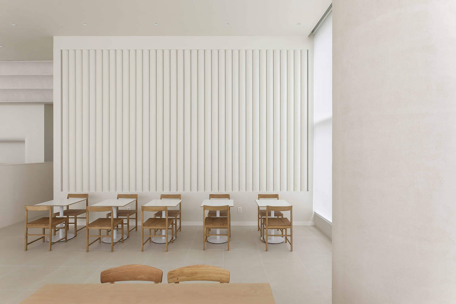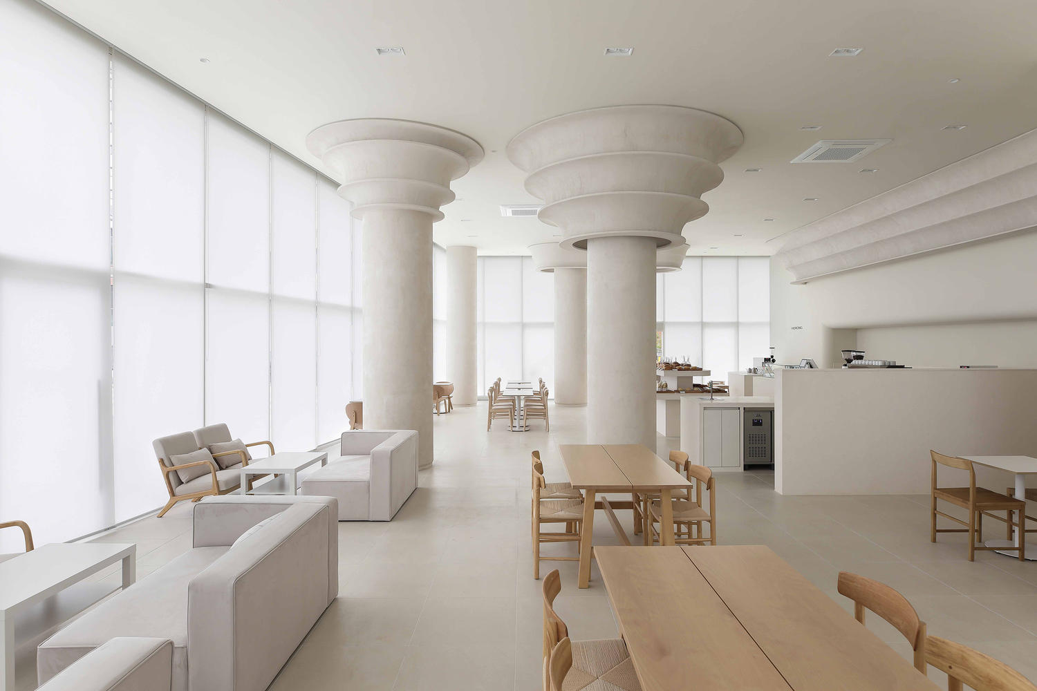 Located in a corner of the Godeok New Town development area, this bakery stands amidst the stark urban landscape, offering a place of respite where one can melt away the fatigue of daily life. The neutral beige tones and the natural light streaming through wide windows harmonize to create a serene and inviting ambiance. This design allows visitors to feel at ease within the warmth of the space, evoking a sense of stability and comfort—almost like being at home. Notably, the large columns, while grand in presence, provide a sense of security, making the space feel even more welcoming.