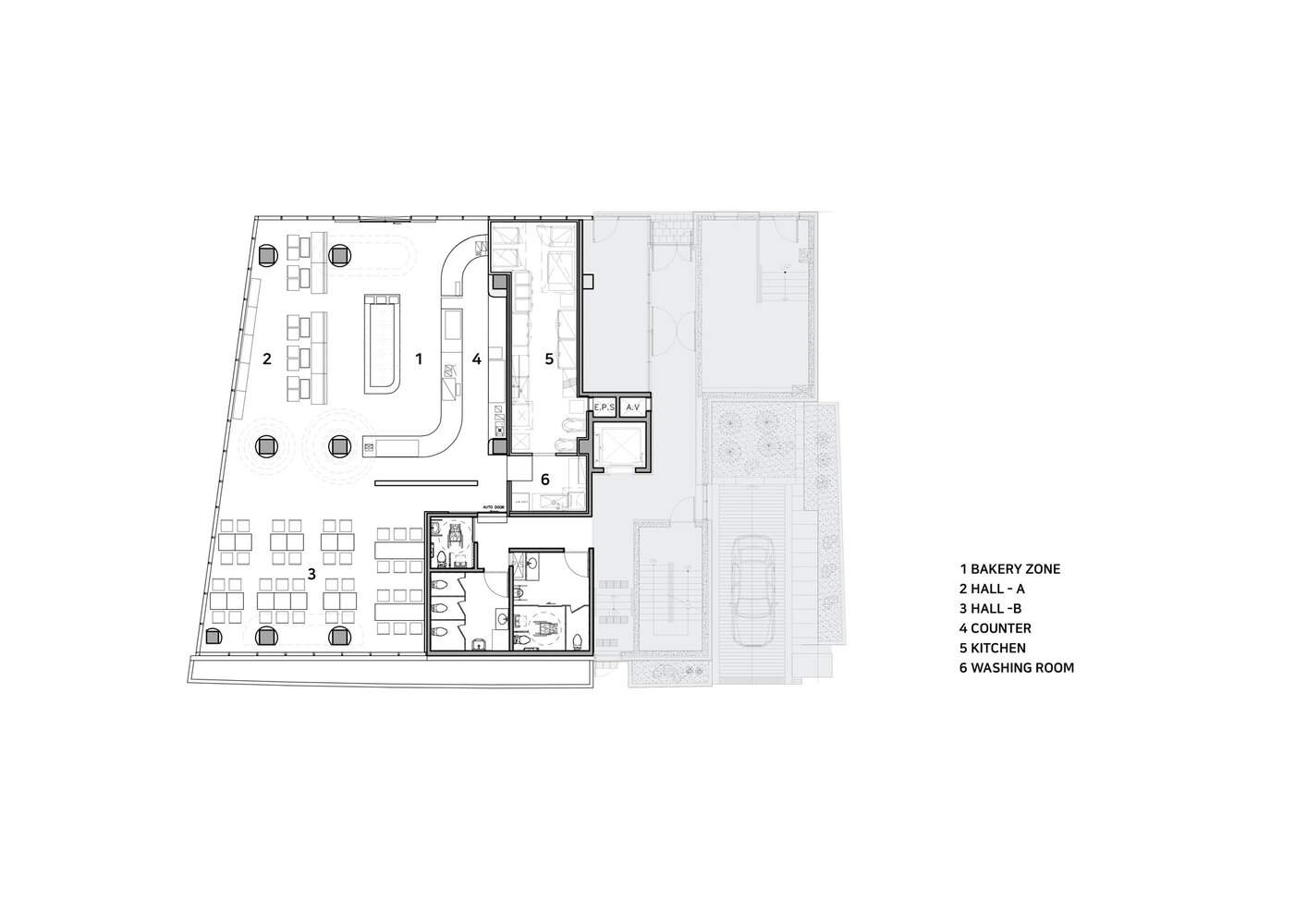 细节设计与功能布局:该项目的精髓体现在对细节的精心设计以及功能布局的巧妙安排。重复出现的圆形元素赋予了空间节奏感和视觉趣味,同时又增添了柔和感。座位区被设计成独立的“岛屿”,既保证了私密性,又方便顾客放松。靠窗的座位设计更是充分利用了自然光,营造出舒适惬意的氛围。面包展示区的设置则巧妙地利用了视觉和嗅觉,面包的香气与室内氛围相辅相成,进一步提升了顾客的体验。这些细节设计共同作用,使得面包房不仅仅是一个消费场所,更是一个能抚慰人心的休憩空间。