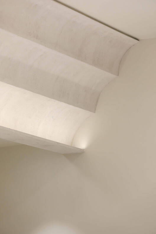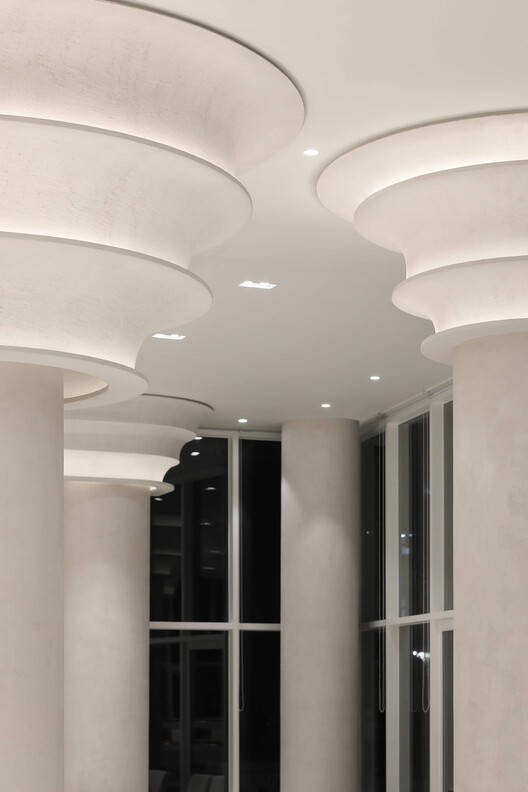 The columns and ceiling feature recurring circular details, adding both grandeur and softness to the space. Light enhances the dimensionality of these structures, giving them a rhythmic and dynamic presence that adds visual interest and vibrancy. Meanwhile, the overall color palette remains cohesive in a single tone, fostering a gentle and calming mood that encourages visitors to fully relax.