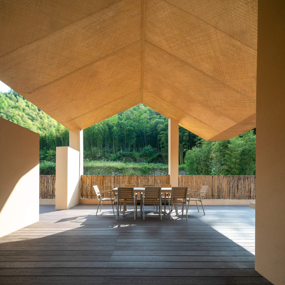 茶室和客房的顶面以起伏的宣纸悬挂为特色,令人联想到分层的山地景观。在楼梯间内,手工制作的宣纸灯笼将灯笼的古董魅力与现代雕塑形式无缝融合。宣纸天花板和手工灯与当地悠久的儒家文化遗产产生了共鸣。入口门、台阶、床头柜、长桌、装饰竹扇等回收的古董元素不仅丰富了文化挂毯,也体现了对自然和历史的根深蒂固的敬畏。