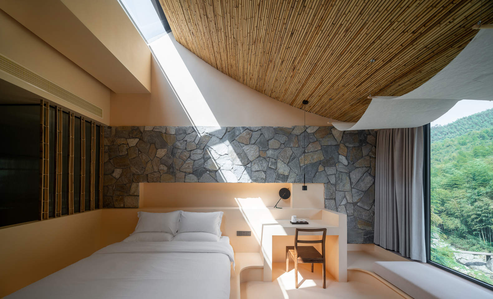 对当地文化和材料的致敬:该项目一大亮点在于对当地文化和材料的深度挖掘和创新应用。设计者大量使用了当地的石材、竹子和宣纸等,赋予了建筑独特的地域特色。竹子的运用堪称神来之笔,无论是作为屋顶天棚、楼梯栏杆还是灯具,都展现了材料的灵活性和美学潜力。此外,设计者还巧妙地融入了藤编、草编等手工编织元素,以及回收的古董元素,这些细节不仅丰富了空间的质感,也体现了对传统文化的尊重和传承。这种对材料的创新运用和文化元素的巧妙结合,使酒店充满了独特的魅力和人文气息,也使其在众多酒店项目中脱颖而出。