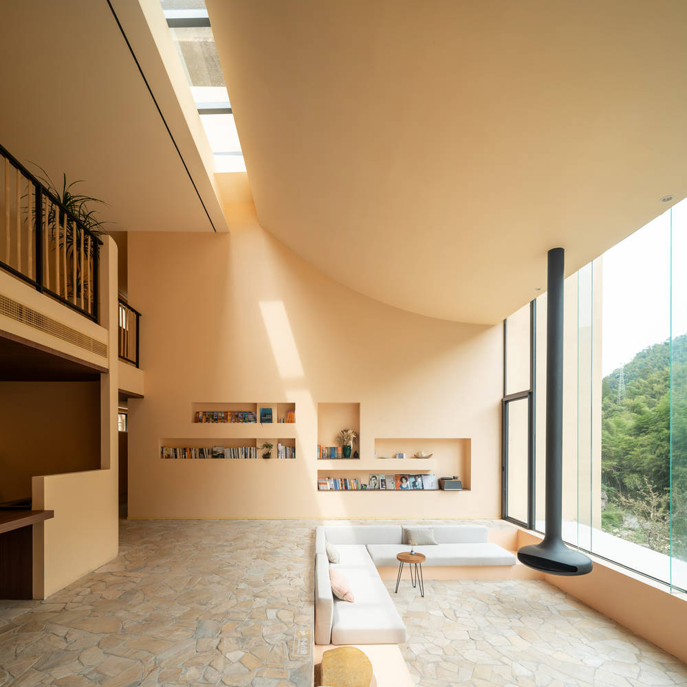 The building gracefully unfolds along the mountain forest, meandering beside the stream, with guest rooms arranged linearly, each offering picturesque views of the stream and mountains. The public area integrates spaces of varying scales in an interconnected manner to cater to diverse needs. The arc-roofed hall serves as the heart of the space, housing multiple functions like a bar, coffee bar, and leisure book bar, catering to social interactions. The skylight allows guests to experience the interplay of light and shadow cast by the stream and bamboo forest at different times.
