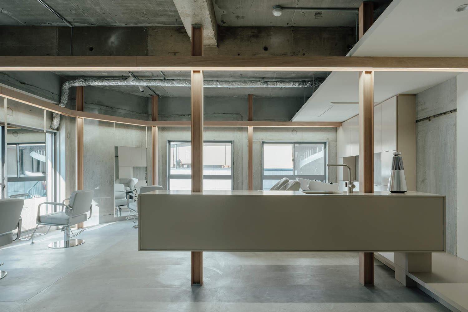 An H-shaped timber frame made of wood, resembling an H-shaped steel frame, was devised for the skeleton of the restored building frame. The counter of the yuqi table is supported by this frame, which is connected to the husband's cutting space, where a mirror is suspended from the beam frame, and the pillars have a face stand and sockets attached to them. I hope that the electric current circulates through the frame like blood so that the two people, who live in different places and have different jobs, can work here as husband and wife, feeling connected to each other as if their blood is flowing under their consciousness.