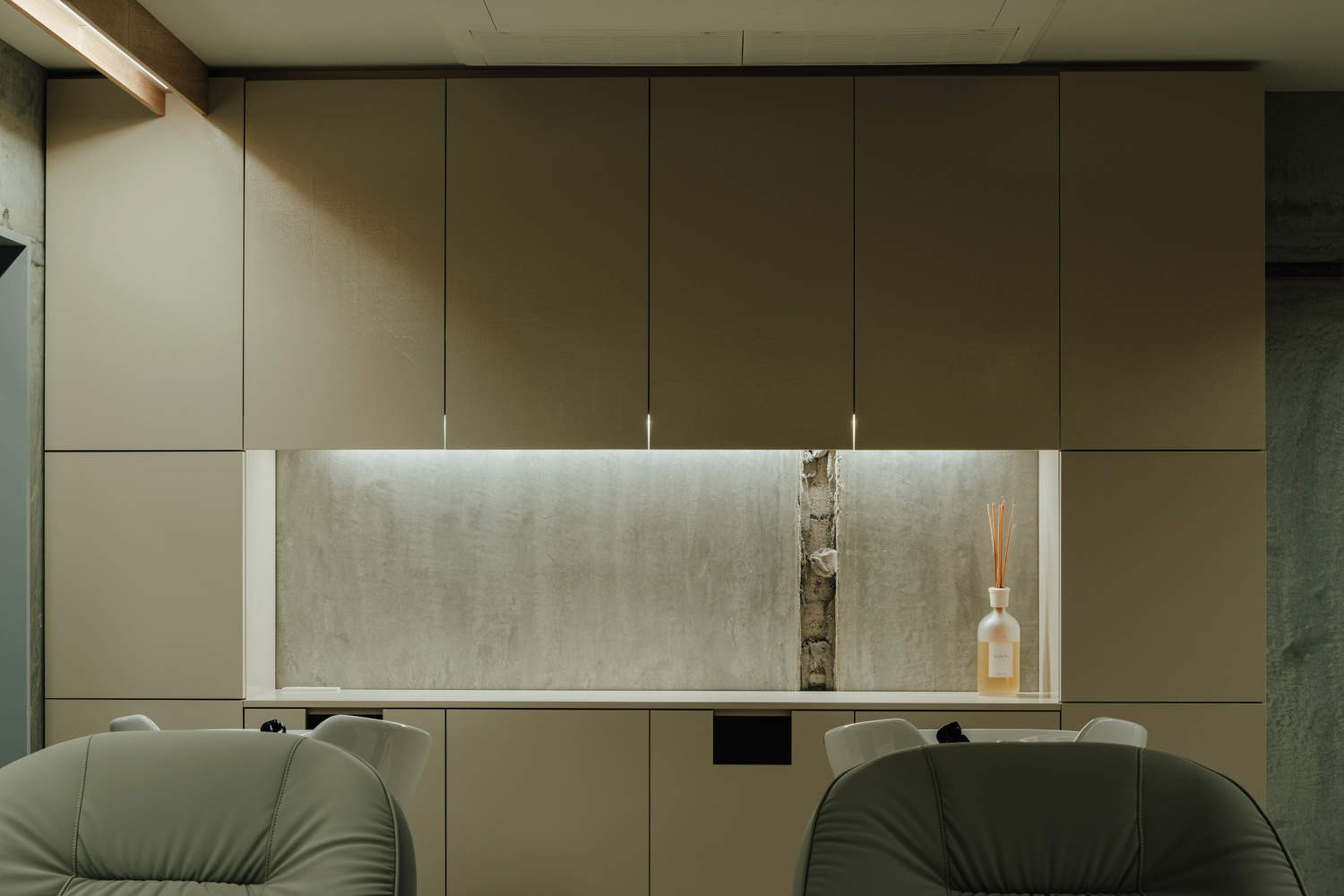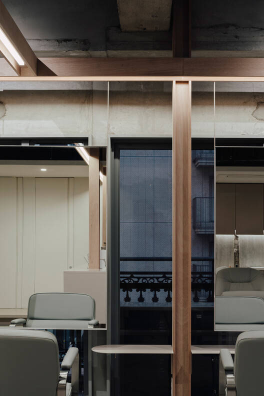 材质与光线的精妙运用: 项目在有限的空间内,通过对材质和光线的精妙运用,实现了视觉上的通透性和空间的延展性。丙烯酸材料的衣帽间设计,有效减轻了视觉负担,也使空间显得更加轻盈和通透。设计师还巧妙利用了光线,使得整个空间在保持功能性的同时,更富于变化和层次感。这不仅提升了顾客的体验,也增强了空间的情感氛围。木材的运用也为空间带来了温暖和自然的质感,与现代设计形成了巧妙的平衡,创造出一种既现代又温馨的氛围,与美发沙龙的定位相得益彰。
