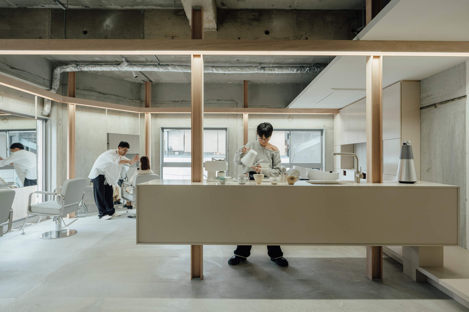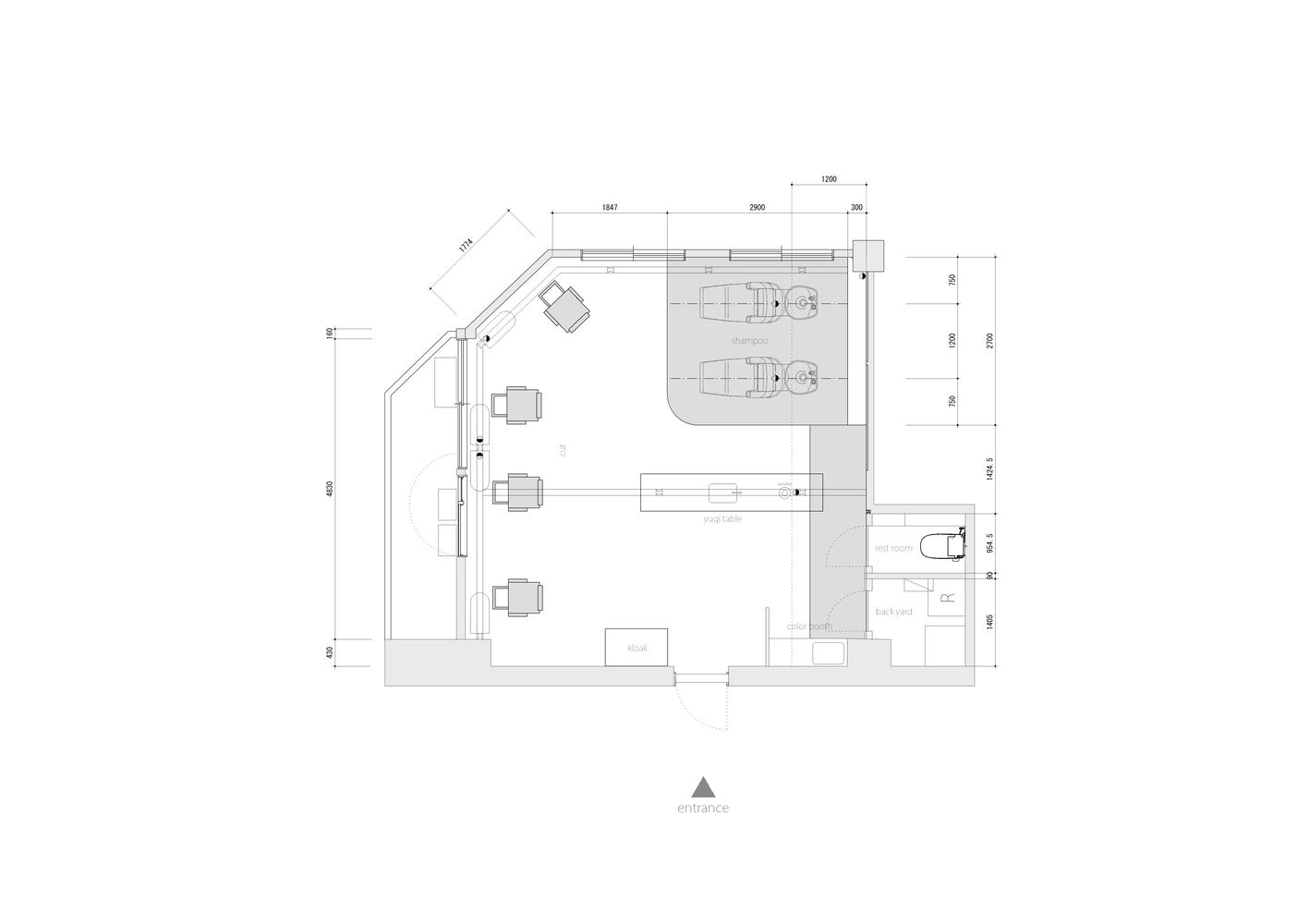 我们确保了四个切割空间和两个洗发水单元,这是45平方米空间内可以容纳的最大数量,并在入口门的末端放置了一个大型接待台,以创造一个浮动的空间。我们将这个空间命名为“yuqi桌”,这样当妻子从东京回来时,她就可以尝试各种各样的东西,比如快闪店。衣帽间由丙烯酸制成,使其存在透明和明亮,因为小空间里充满了椅子和柜台等大量物品。