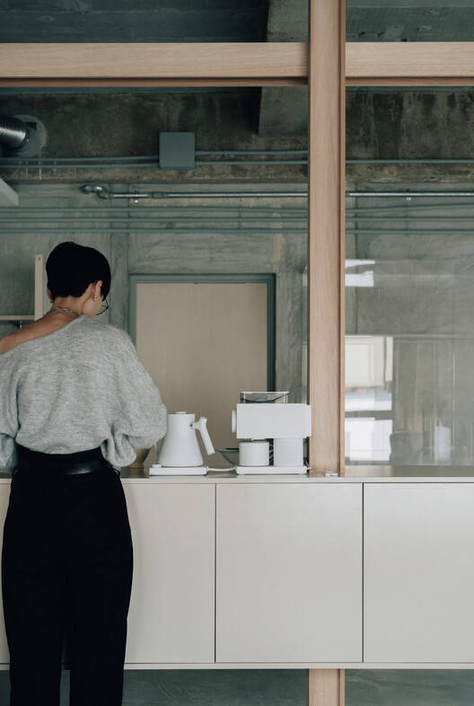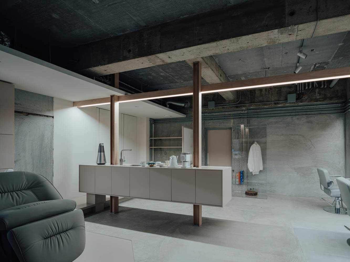 为修复后的建筑框架的骨架设计了一种由木材制成的H形木框架,类似于H形钢架。玉祁桌的台面由这个框架支撑,这个框架连接到丈夫的切割空间,在那里,一面镜子悬挂在梁架上,柱子上有一个脸架和插座。我希望电流像血液一样在框架中循环,这样生活在不同地方、从事不同工作的两个人就可以在这里作为夫妻工作,感觉彼此相连,仿佛他们的血液在他们的意识下流动。