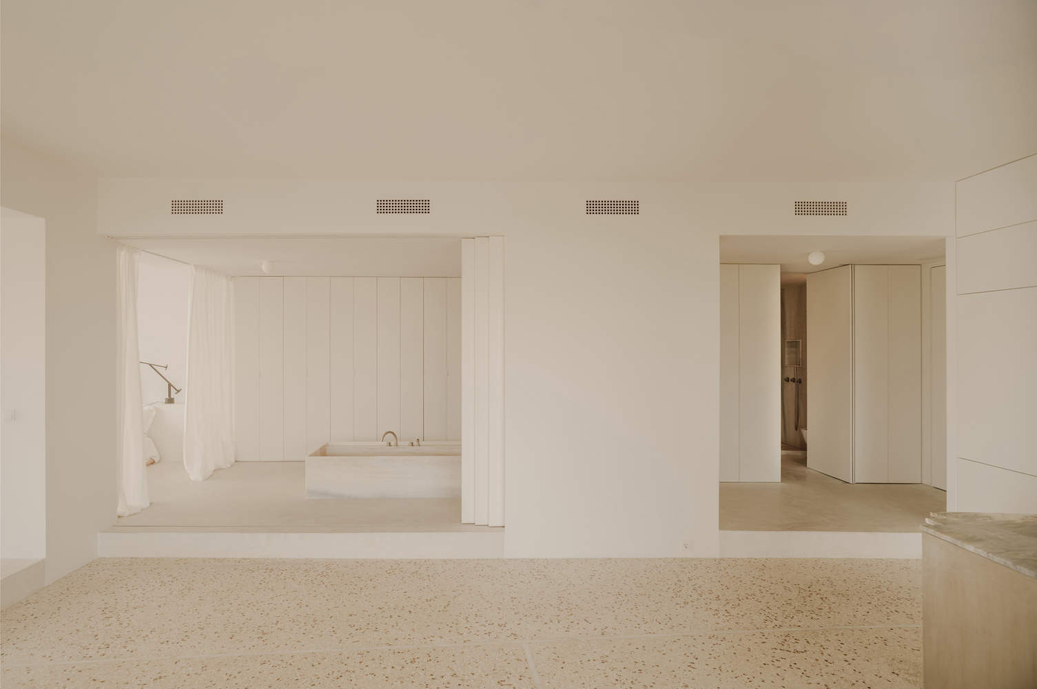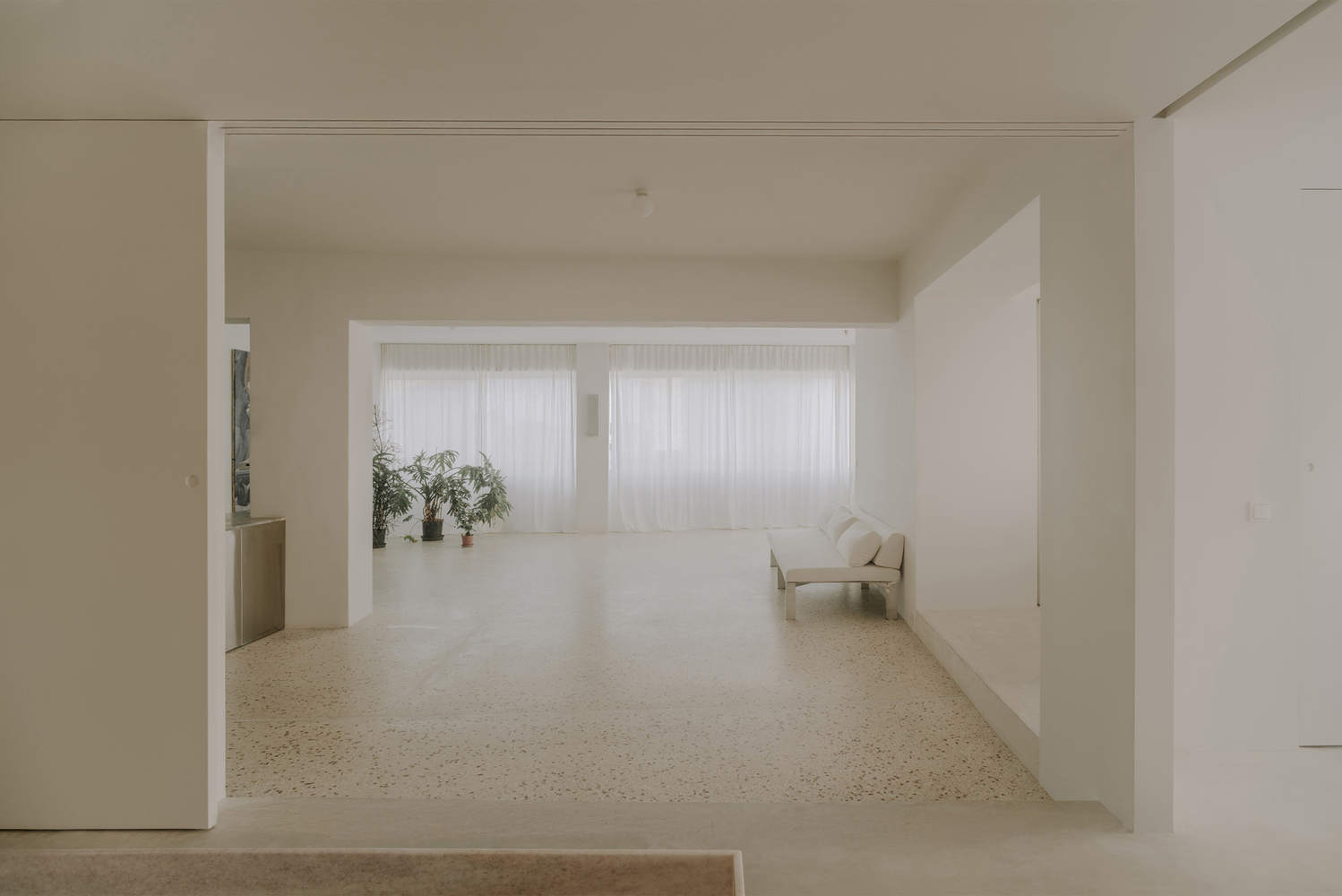 The main feature of the composition is the creation of a strict limit that divides the plan in two distinct parts. The first part refers to the perimetrical zone while the second one refers to the blank space that is generated by it. The perimetrical space is where the limit acquires depth and height and transforms into a 3d multifunctional domestic zone. The main characteristic of this zone is the elevated floor, which operates like an infrastructural platform (plumbing, sewage, heating, etc.) and at the same time its form indicates the separation of a more intimate environment (bedrooms, bathrooms), from the rest of the apartment. Moreover, through sliding panels this zone is subdivided into smaller spaces with dynamic limits, allowing for further degrees of privacy. As a result, an enfilade of rooms is formed, which can be used independently or in junction, and can enable the continuous promenade of all the spaces.