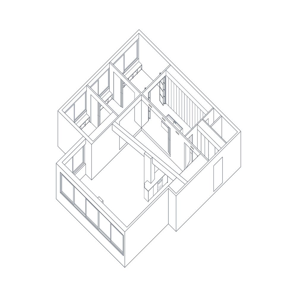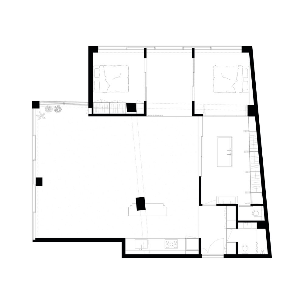 构图的主要特征是创造了一个严格的限制,将计划分为两个不同的部分。第一部分是指周边区域,第二部分是指由其产生的空白空间。周边空间是极限获得深度和高度并转化为3d多功能住宅区的地方。这个区域的主要特征是高架地板,它就像一个基础设施平台(管道、污水、供暖等)一样运作,同时它的形式表明了一个更亲密的环境(卧室、浴室)与公寓的其他部分的分离。此外,通过滑动面板,该区域被细分为具有动态限制的较小空间,从而提供了更高程度的隐私。因此,形成了一系列房间,可以独立使用或结合使用,并可以使所有空间连续散步。