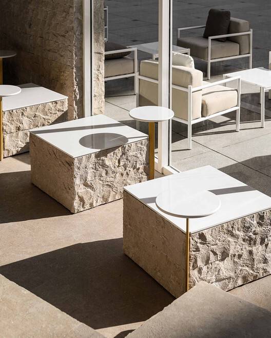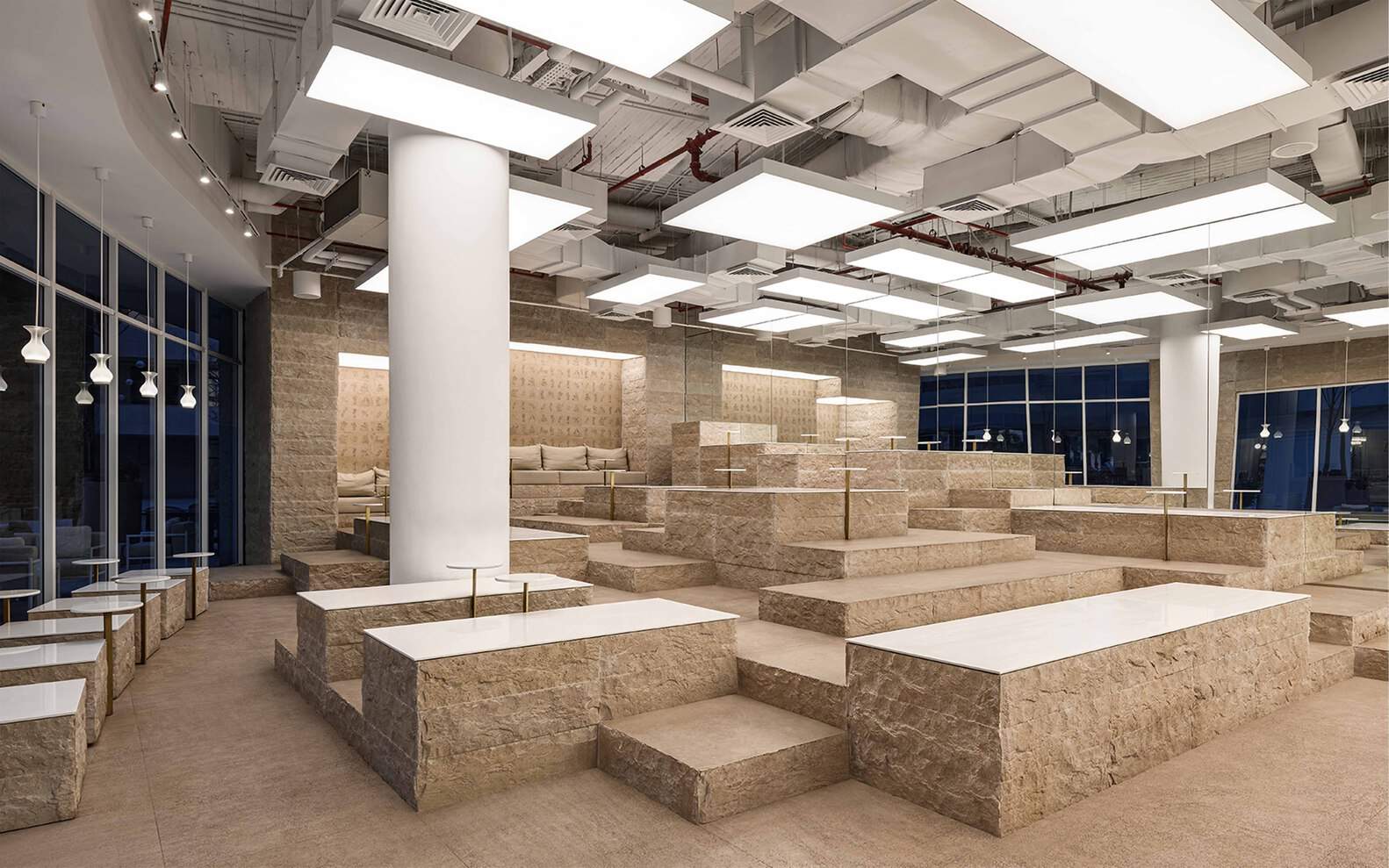 空间概念的创新性诠释:这个项目最引人注目的地方在于其对“堆积”概念的独特诠释。设计师巧妙地将800mm模块化的石灰岩以阶梯状的方式堆叠,创造出一个仿佛从采石场延伸出来的空间。这种设计手法打破了传统咖啡厅的平面布局,营造出有机流畅的空间感和富有变化的视觉层次。石灰岩的运用本身就赋予了空间一种原始的质感,与埃及的古老文化底蕴相呼应。通过“堆积”这一核心概念,设计师成功地将建筑与环境、历史与现代、实用与美学完美地结合在一起,打造出一个既具有视觉冲击力,又充满舒适感的咖啡烘焙场所。