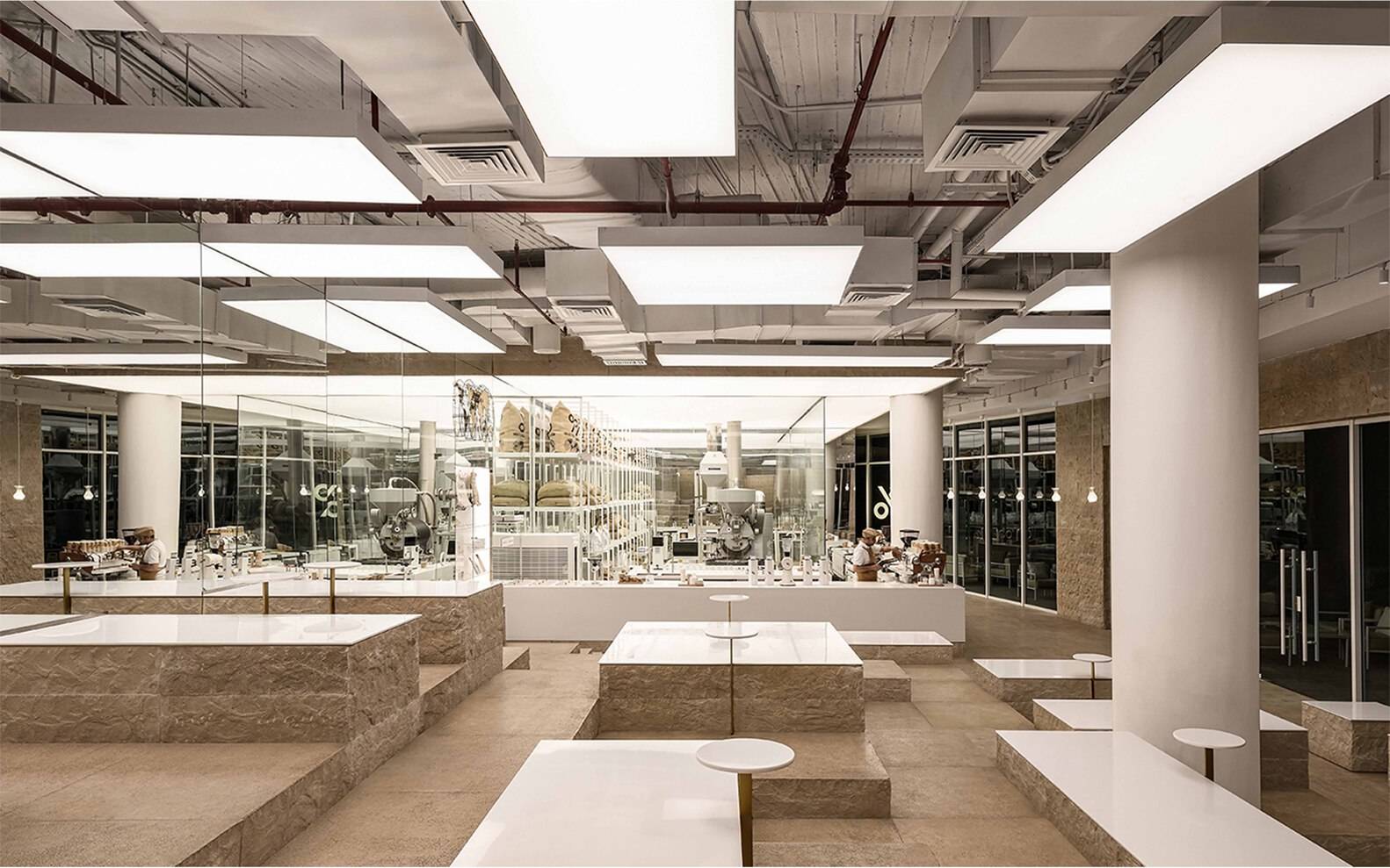 建筑师提供的文字描述阿拉比卡烘焙厂首次在位于新开罗市中心的U-Venues综合体展出。埃及位于尼罗河流经该国的北非,是一个散布着古代遗迹的广阔沙漠地区。在国家历史文化底蕴深厚的同时,现代城市发展也在不断进步。这个空间的设计灵感来自“堆积”的概念