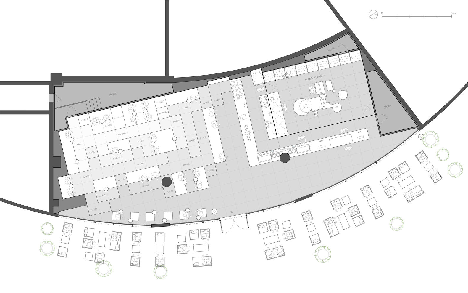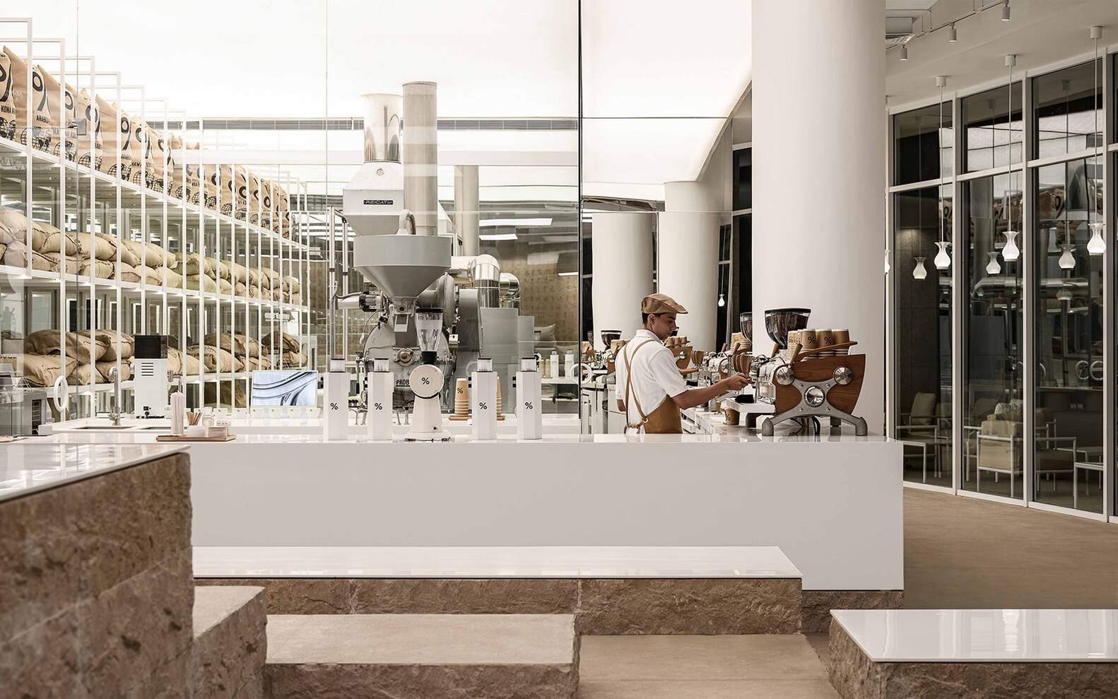 To express the irregular landscape of the quarry throughout the entire space, limestone rocks modularized into 800mm are stacked in a stair-like manner from the roasting room and coffee counter to the seating area. This creates an organic flow and varying height differences, resulting in a comfortable space with balanced sight lines.