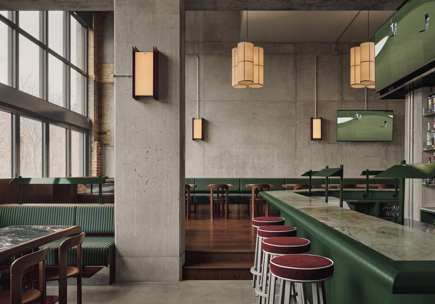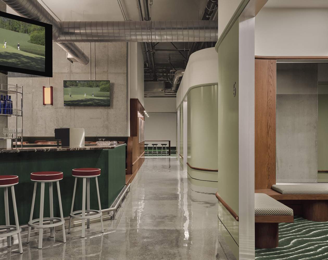 Materials & Finishes -To balance the industrial setting with warmth and sophistication, the material palette draws inspiration from classic golf club aesthetics. Deep forest greens, lighter putting-green tones, and rich burgundy accents create a refined yet vibrant atmosphere. Red oak veneer clads several walls and custom millwork elements, bringing a sense of intimacy to the otherwise raw concrete and brick shell.