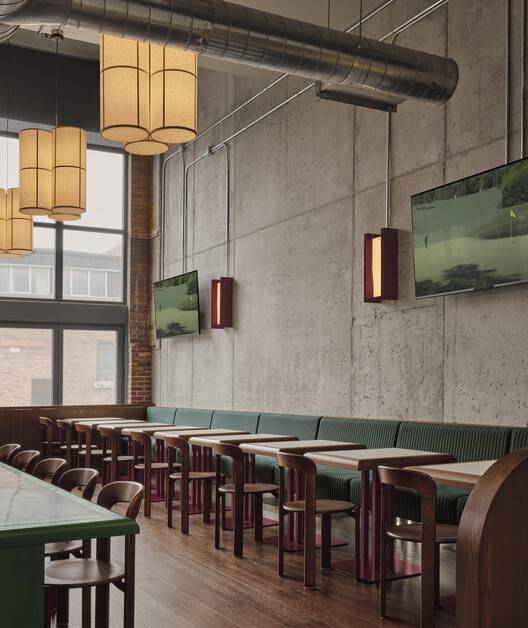 建筑师提供的文字描述Text description provided by the architects. Muni is an indoor golf club designed to offer an immersive and social experience. The Nordelec, a vast industrial heritage building dating back to 1913, provides an impressive backdrop for this unique venue. Its brick-clad façade and expansive windows set the stage for an interior where exposed concrete floors, structural steel, and raw brick walls maintain the industrial character of the space while contrasting with warm, refined interventions.