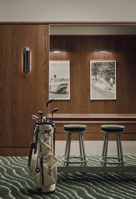 布局与;空间流动-Muni占地6943平方英尺(645平方米),位于一楼角落,有一个专用入口。旅程从双层入口区开始,该区域设有一个零售区,提供高尔夫服装和设备。一个深绿色橡木贴面的光滑接待台固定了这个空间,一长串现有的混凝土楼梯将客人带到主俱乐部区。定制木制品无缝集成到这些步骤中,将它们变成流通路径和零售展示。中央走廊从接待区延伸出来,将空间组织成不同但相互连接的区域。在一侧,七个私人高尔夫模拟器休息室成对排列,最后一个休息室容纳三个模拟器。每个休息室都被设计成一个半私人客厅,设有一张带凳子的高顶桌子、豪华长椅座位和嵌入式休息区,营造出轻松、对话的氛围。座位区上方的格子灯提供了环境照明,强化了俱乐部独特的美学。
