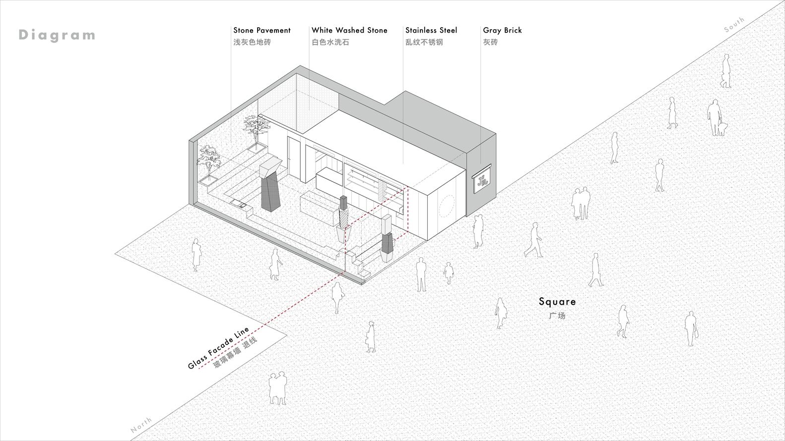 The whole space is dominated by white and grey, which echoes the colors of White Pagoda Temple, and also forms a sharp contrast with the bakery on display. The white and light grey stones extend from the outdoor ground to the deepest wall of the interior. Each stone has different textures, responding to the stainless-steel volume inserted into the square. The three original wooden structural columns in the space are designed to sculptural forms to hide their original structures. They contrast with the simple and unified ground stone and stainless-steel volume, strengthen the sense of hierarchy of space, and attract the attention of pedestrians in the square. The frosted acrylic light boxes installed on the ceiling extend from the exterior to the interior, blurring the spatial boundary, while illuminating the grey brick exterior wall and the entire interior space. The exterior walls are equipped with irregular rectangular windows, whose random forms attract the attention of pedestrians, forming a visual focus, echoing the interior sculptural columns, emphasizing the unity and the sculptural sense of the space, eventually giving the place a stronger artistic expression.