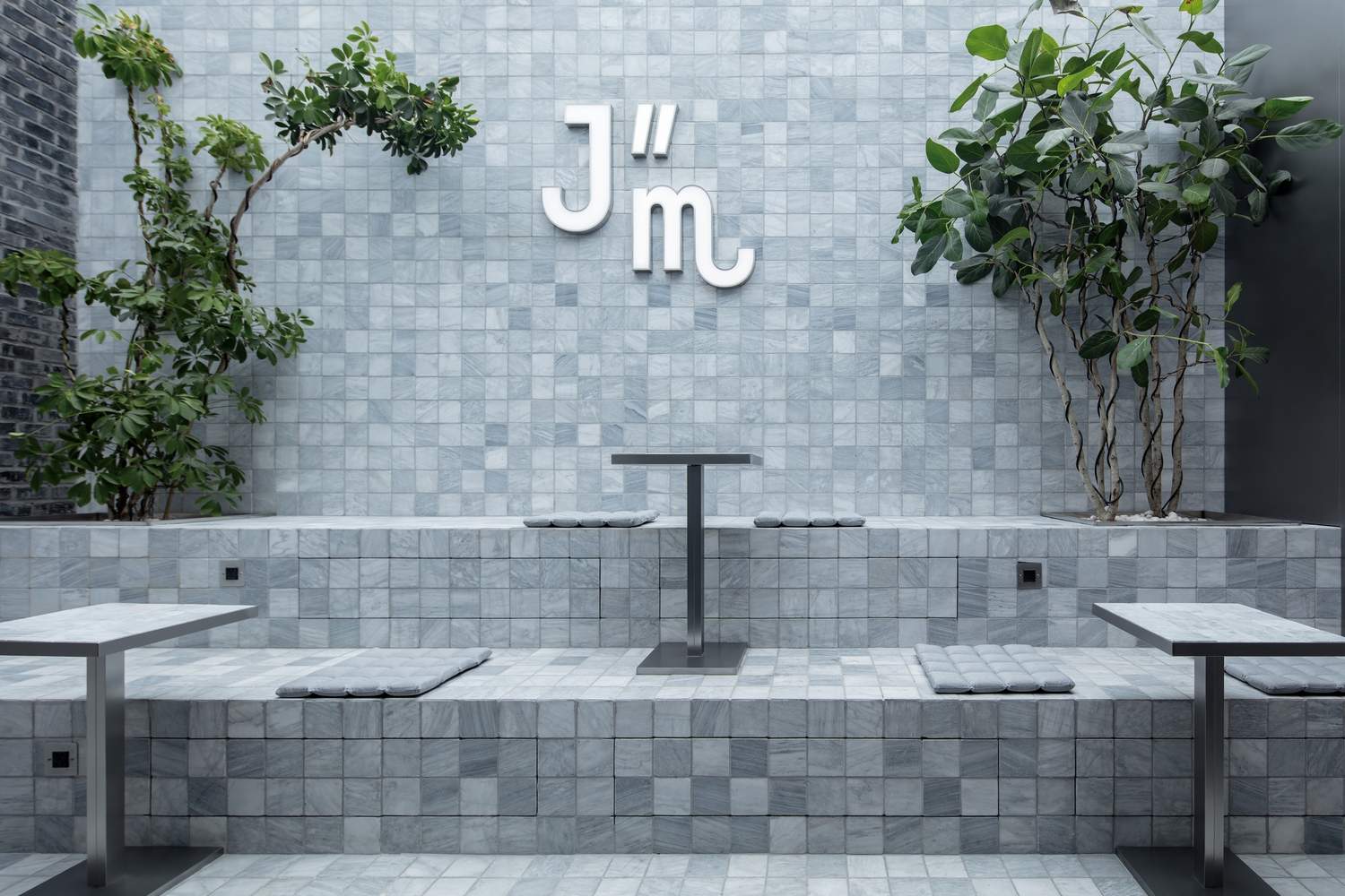 The glass façade slightly recedes to the interior, subtly creating a semi-outdoor space. People sit here overlooking the square and enjoy a moment of tranquility, while the semi-outdoor space also functions as a shelter from rain. The stainless steel element extends from the façade to the interior, integrating the bakery display area, the cashier area and the kitchen. The ground stone adjusts the height and shape with the change of functional areas in a layer-by-layer way. The stone design sits from the square through the semi-outdoor space, to the deepest part of the interior, and the decoration strengthens the sense of spatial fluidity and layering. In the deepest part of the café, the stepped seating area is surrounded by large plants, and the skylight brings in the sky view and abundant natural lights, making the space transparent and vibrant.