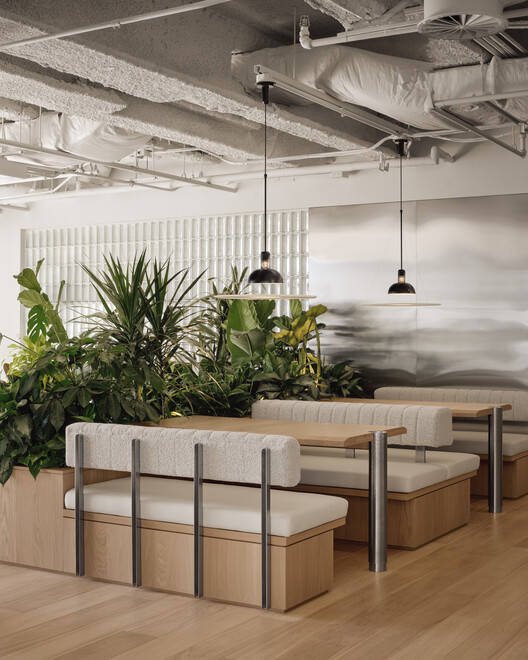 空间布局的创新与功能性:项目的另一个亮点在于其对工作空间布局的创新。它打破了传统的开放式办公空间模式,通过精心设计的多元化区域,如休息区、绿植角落、电话亭等,来促进协作与互动。这种设计理念不仅提升了工作效率,也创造了更舒适、更人性化的办公环境。尤其值得称赞的是,设计师巧妙地利用了厨房和用餐区的位置,使其成为一个能捕捉自然光、提供城市全景,并促进交流与协作的中心。这种空间布局的精心设计充分体现了设计师对功能性和用户体验的深刻考量。