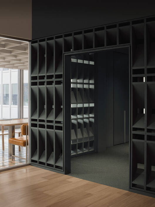 Upon entry, visitors are beckoned through a vestibule enclosed by a geometric screen wall composed of blocks inspired by thebrutalist aesthetic of a nearby power station. This nod to Montreal's architectural history serves as a distinct gateway into theworkspace.