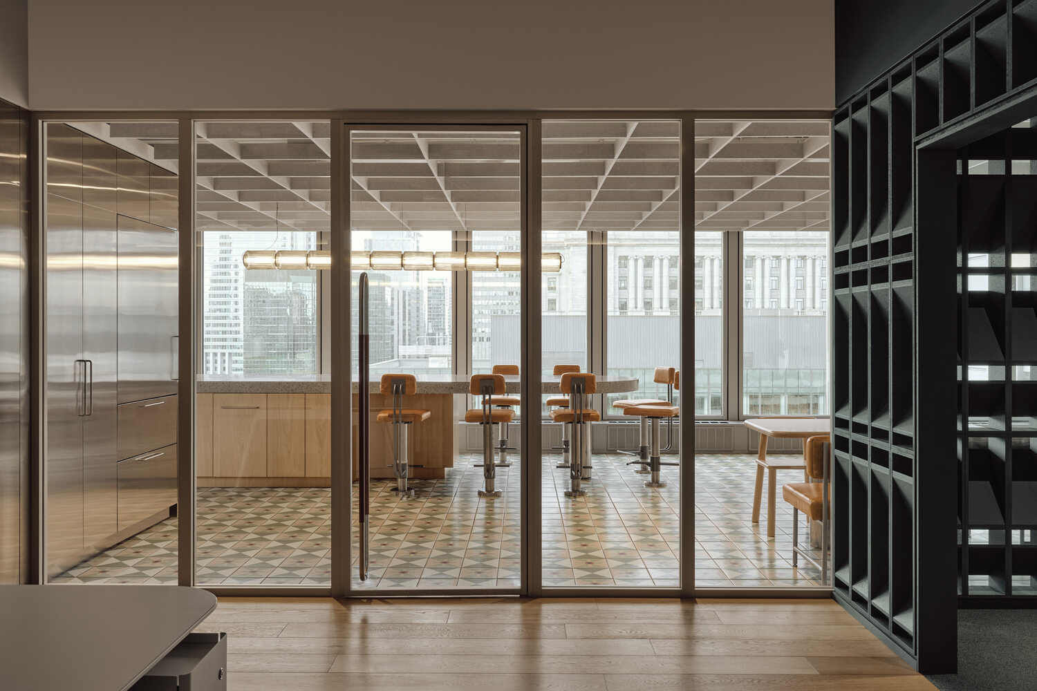 The versatile kitchen and dining area, strategically positioned to capture natural light and offer sweeping vistas of downtownMontreal, serves as a hub for meetings and collaboration. With the urban skyline as its backdrop, this space becomes the dynamiccenterpiece of the office.