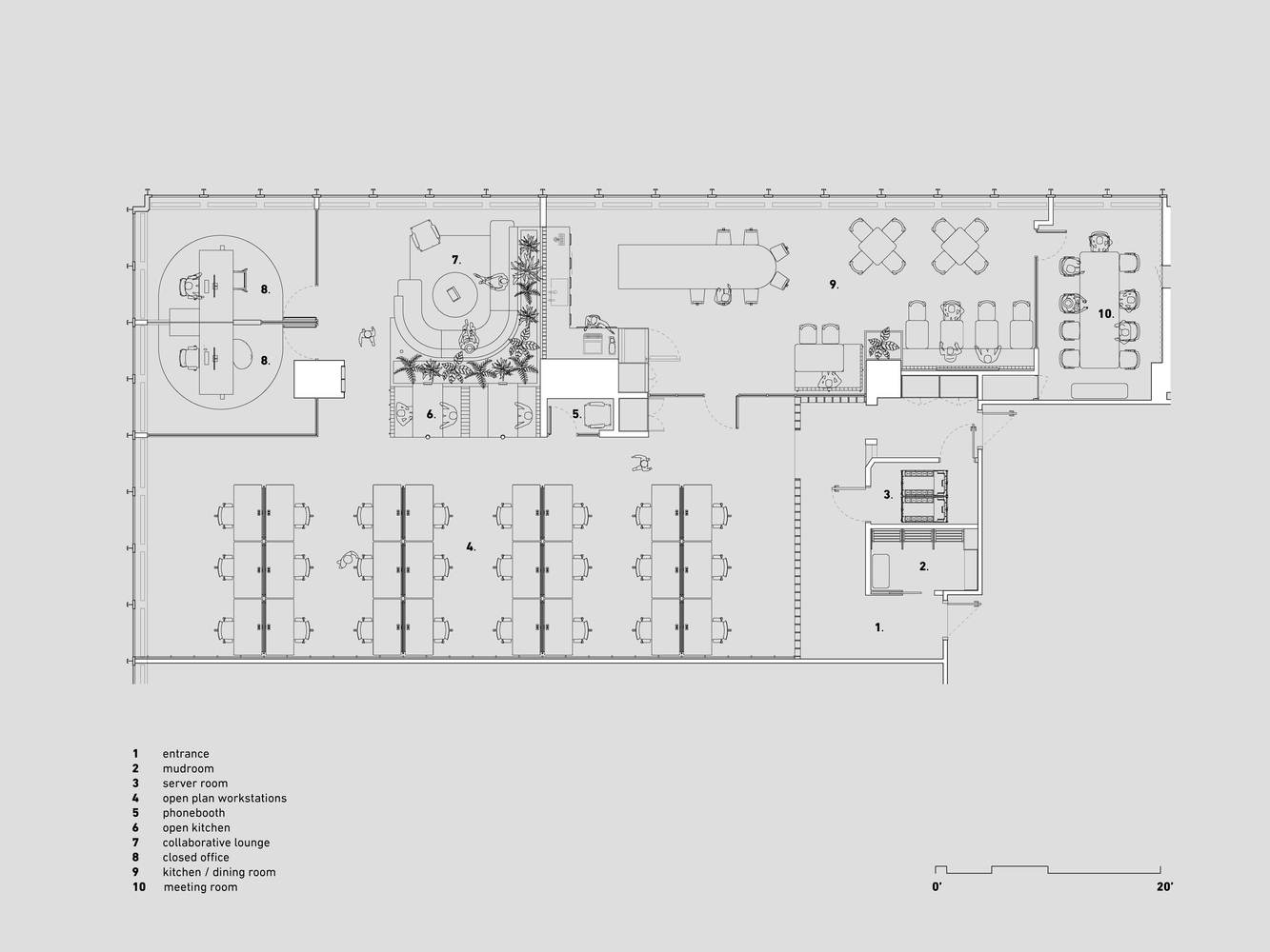 进入后,游客会被召唤穿过一个由几何屏风墙包围的门厅,屏风墙由受附近发电站自然主义美学启发的街区组成。对蒙特利尔建筑历史的致敬是进入工作空间的独特门户。