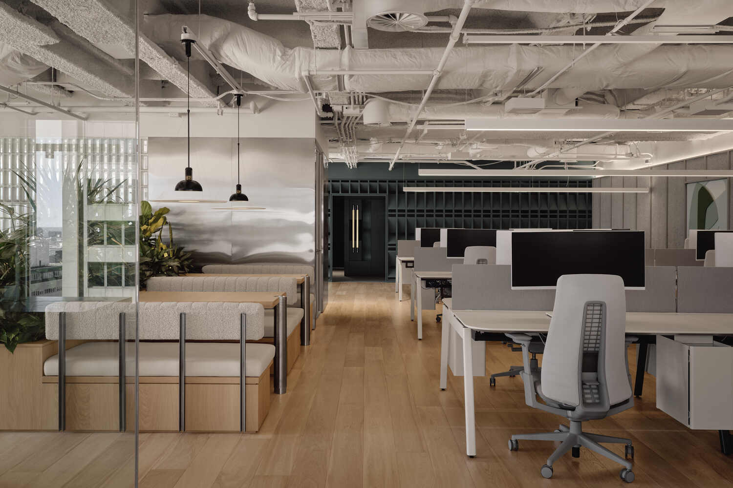 开放式布局促进了协作和互动,包含了各种突破区域。一个为家庭舒适而设计的僻静休息区与一个绿树成荫的角落和相邻的座位并置,在划定工作空间的同时促进了同事之间的对话。此外,相邻的电话亭为员工提供了隐私和不间断的工作流程。