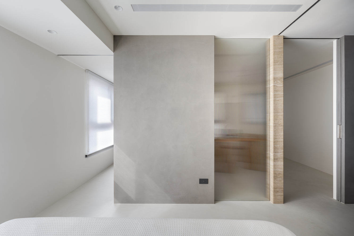 In terms of design technique, a short wall is used at the entrance to keep sightlines and light on both sides transparent, and floors of different materials are used to create an entrance space. A travertine column is placed in the center of the home, with it as the axis, allowing the unique texture of natural materials to bridge different areas.