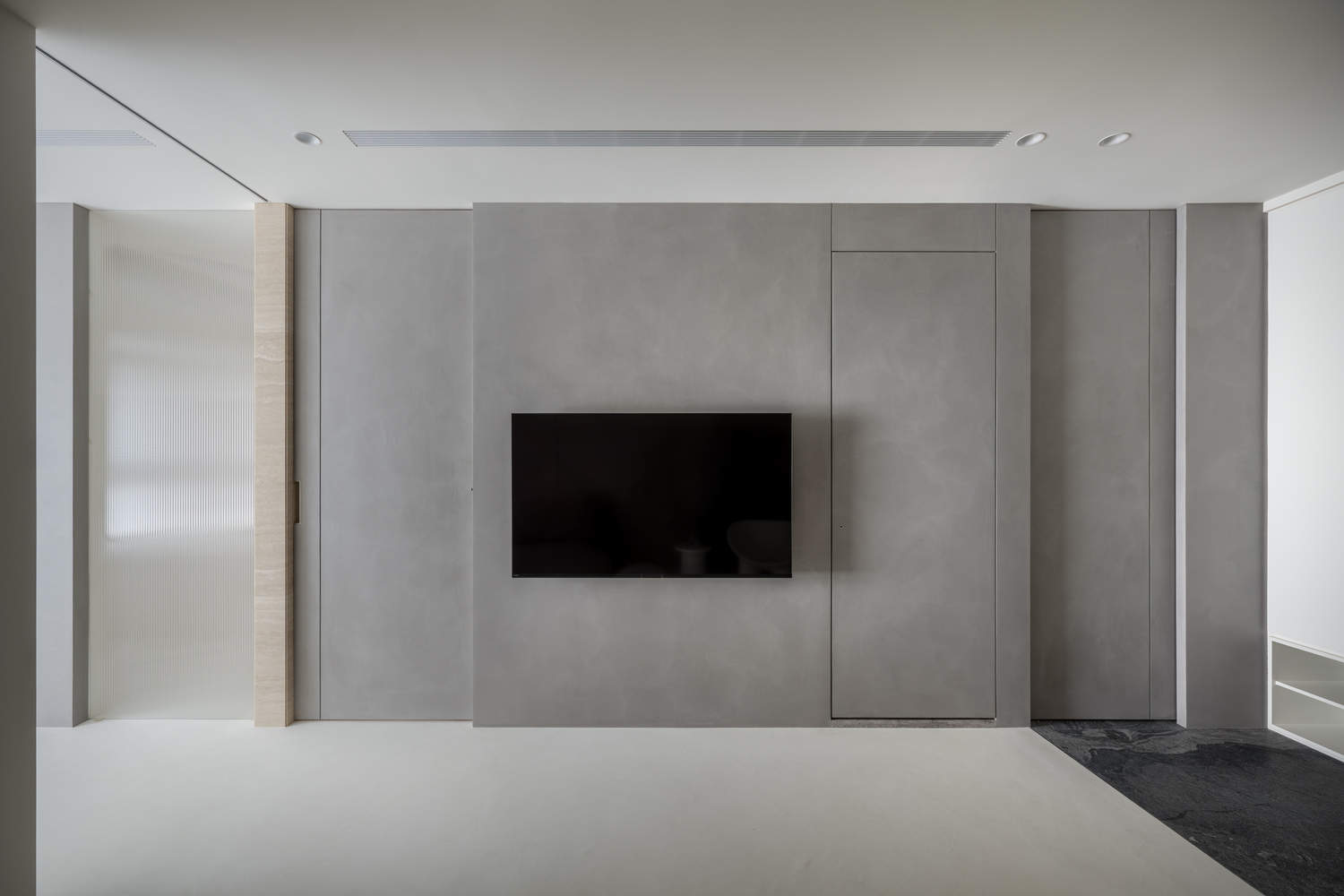 In this space, achromatic black, white, and gray are used as the keynotes to create a modern background, supplemented by the unique texture of hand-made paint to embellish the area, superimposing the warmth of the touch. Through asymmetrical cabinets and shelves, light and space reflect each other.