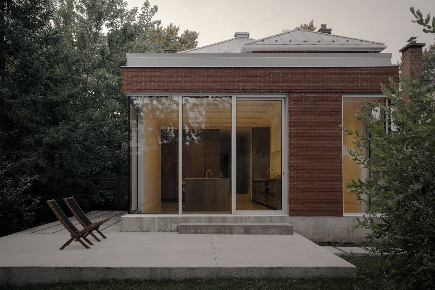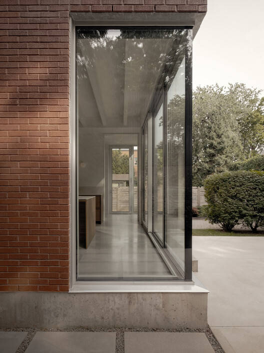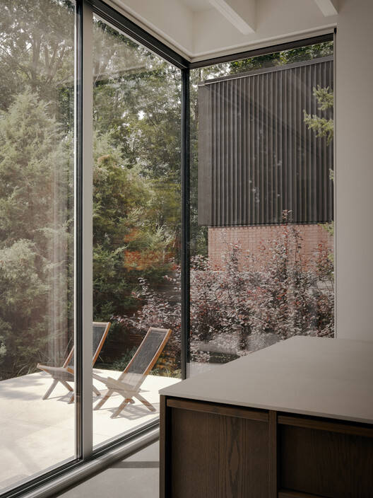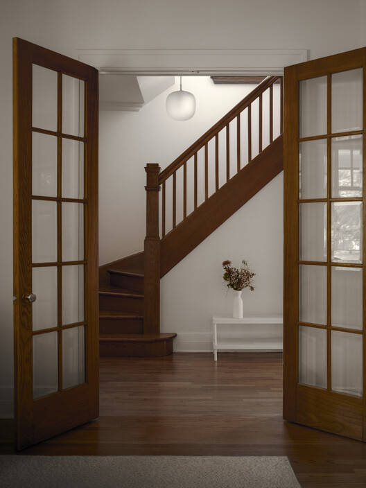 Text description provided by the architects. The Birch residence is part of an early 20th-century development in the town of Saint-Lambert, Québec. The original building, with its generous architecture, featured ornamental woodwork and evoked the domestic elegance of the last century. However, the design, with its partitioned rooms, conflicted with contemporary living. The aim was to create fluid, uncluttered spaces that connect to the yard, addressing previous design shortcomings. A compact volume was also built at the rear to house the kitchen. The new interior layout is organized in two main axes: services and circulation, and living spaces. The kitchen is now the focal point, promoting a natural flow between the ground floor and the exterior. The house's features are reinterpreted with contemporary touches, such as stained wood veneers, trim work, larger openings, and new views toward the garden. The material palette blends the warmth of wood with the coolness of concrete. A prism of masonry, echoing the original materiality, the volume establishes a formal contrast with the turn-of-the-century building. At once alien and familiar, the extension stands out without confronting.