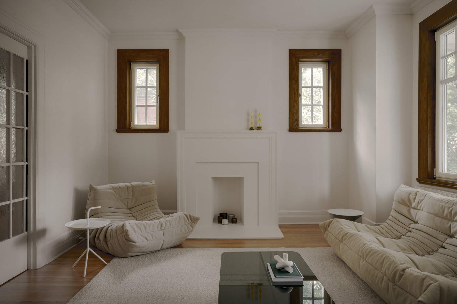 关于楼上已经很亲密的特点,这里的干预措施很少。这些措施包括恢复硬木地板、装饰线和窗户等原始组件,并重新组织某些开口以优化流通。