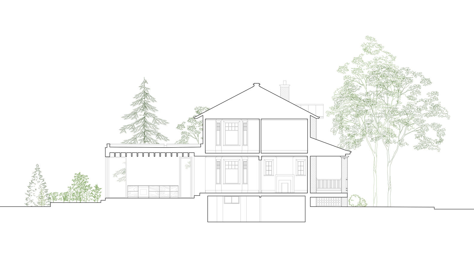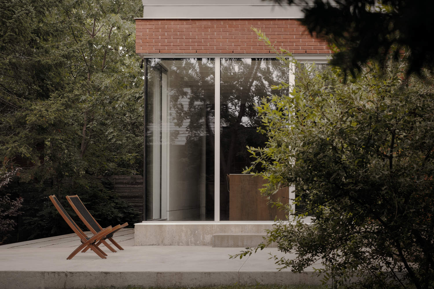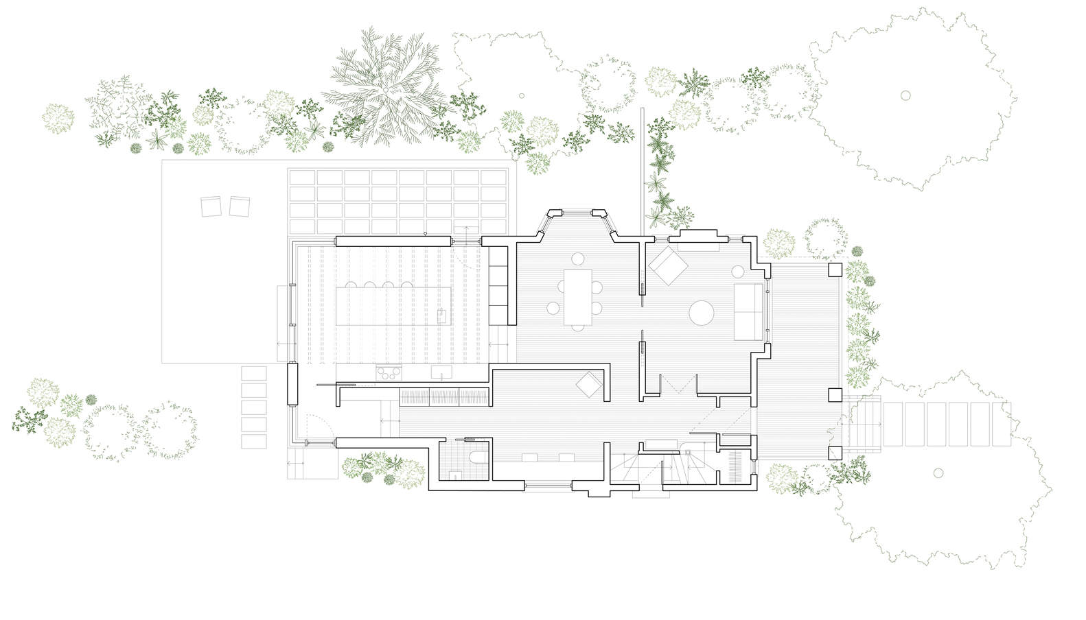 Although the site had undeniable landscape qualities, the main floor level of the existing building was high in relation to the natural topography, making it difficult to properly enjoy the garden. While offering more generous ceiling heights for the kitchen, the embedding of the extension gradually reconnects the interior spaces with the rear yard. The outdoor terrace is thus in continuity with the building's functions and acts as a pedestal around which the landscaping is laid.